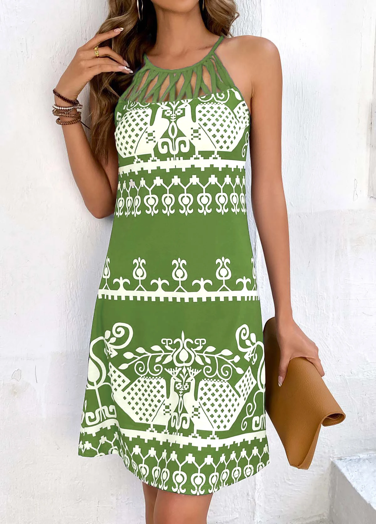 Be the first to review “Avocado Green Cage Neck Tribal Print Dress” Cancel reply