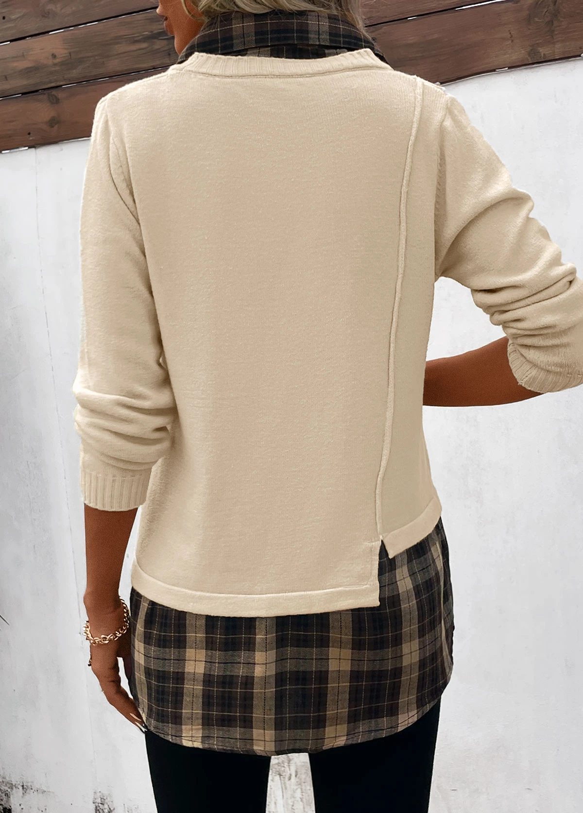 Beige Fake 2in1 Plaid Long Sleeve Shirt Collar Sweatshirt