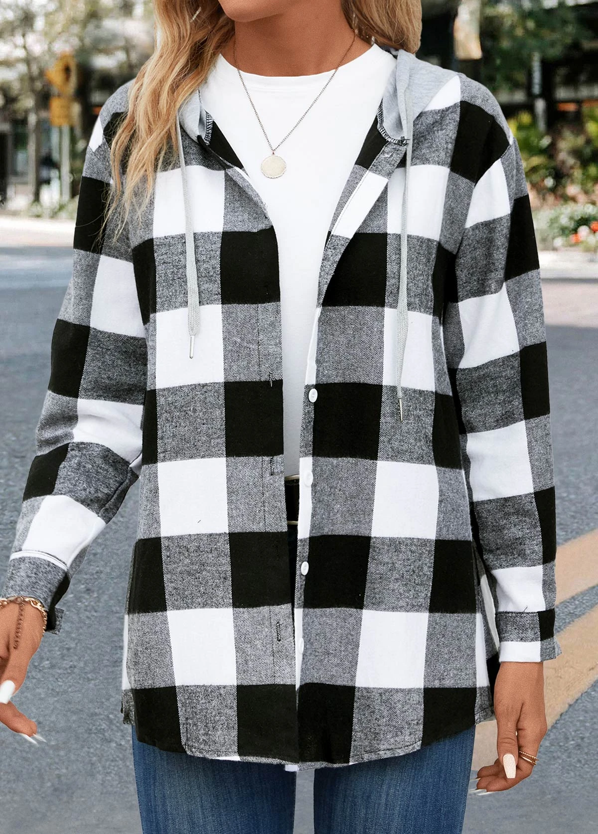 Be the first to review “Black Button Plaid Long Sleeve Hooded Coat” Cancel reply