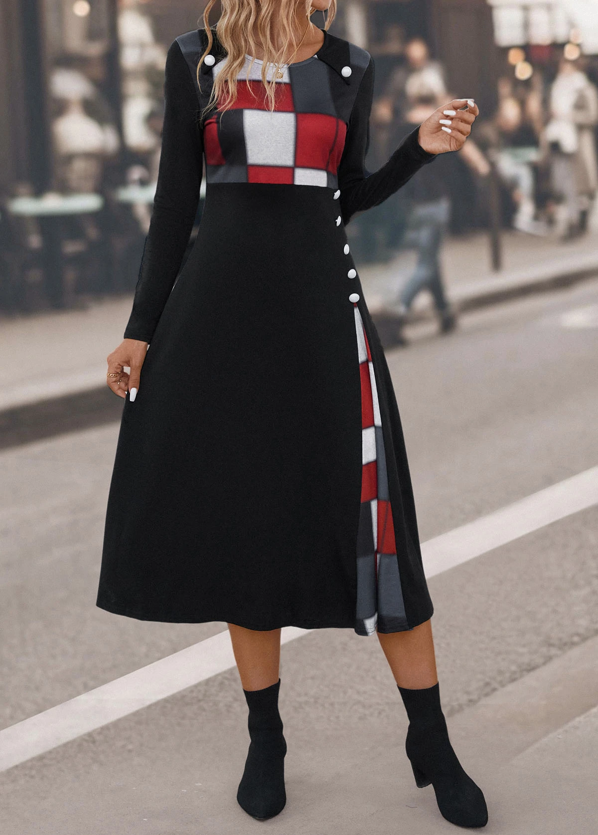 Black Button Plaid Three Quarter Length Sleeve Dress