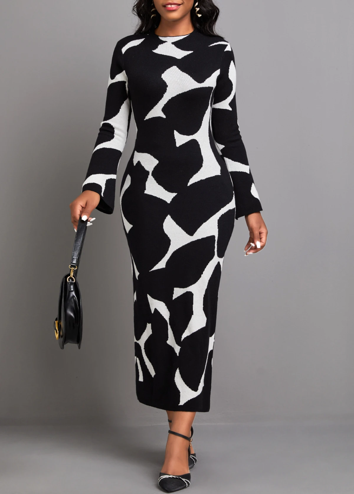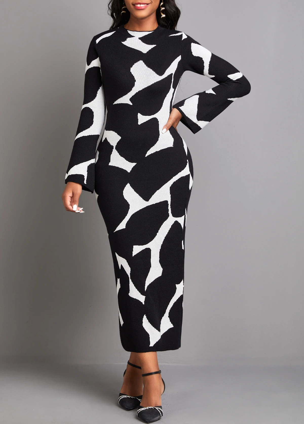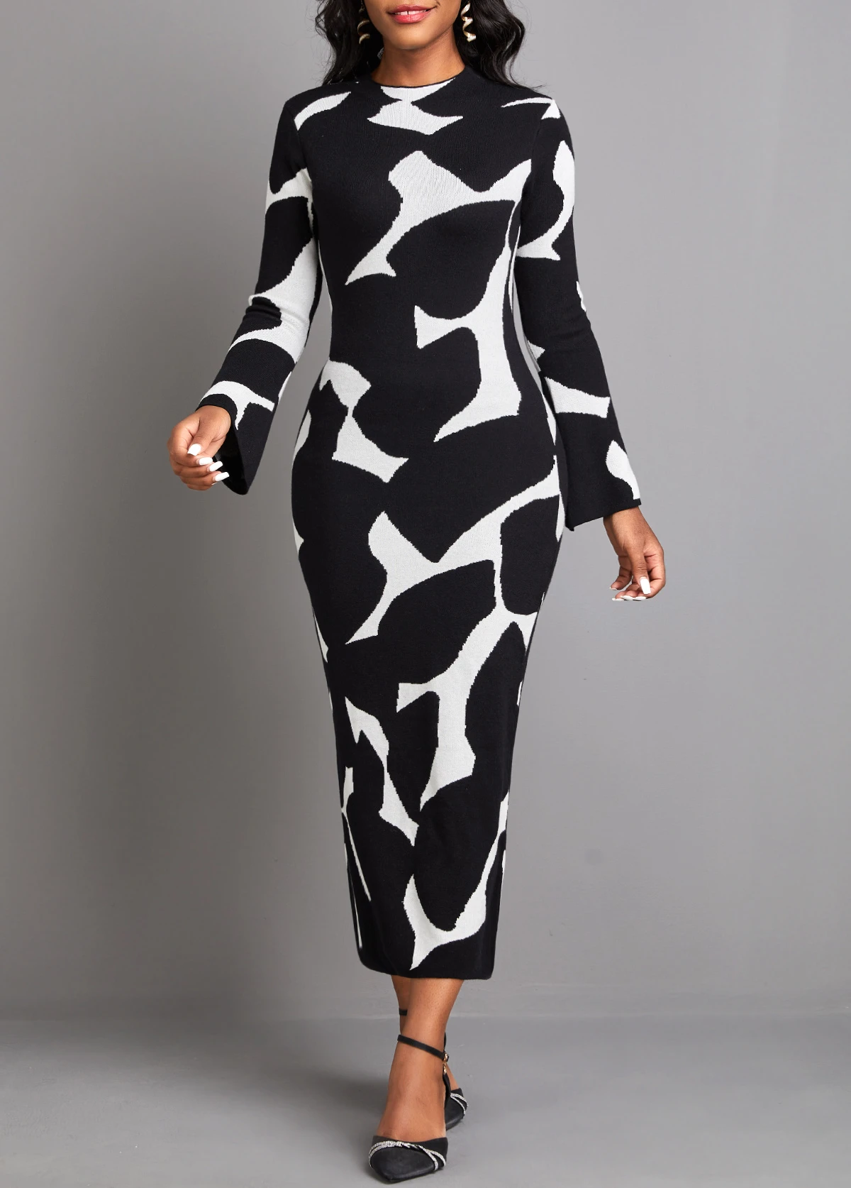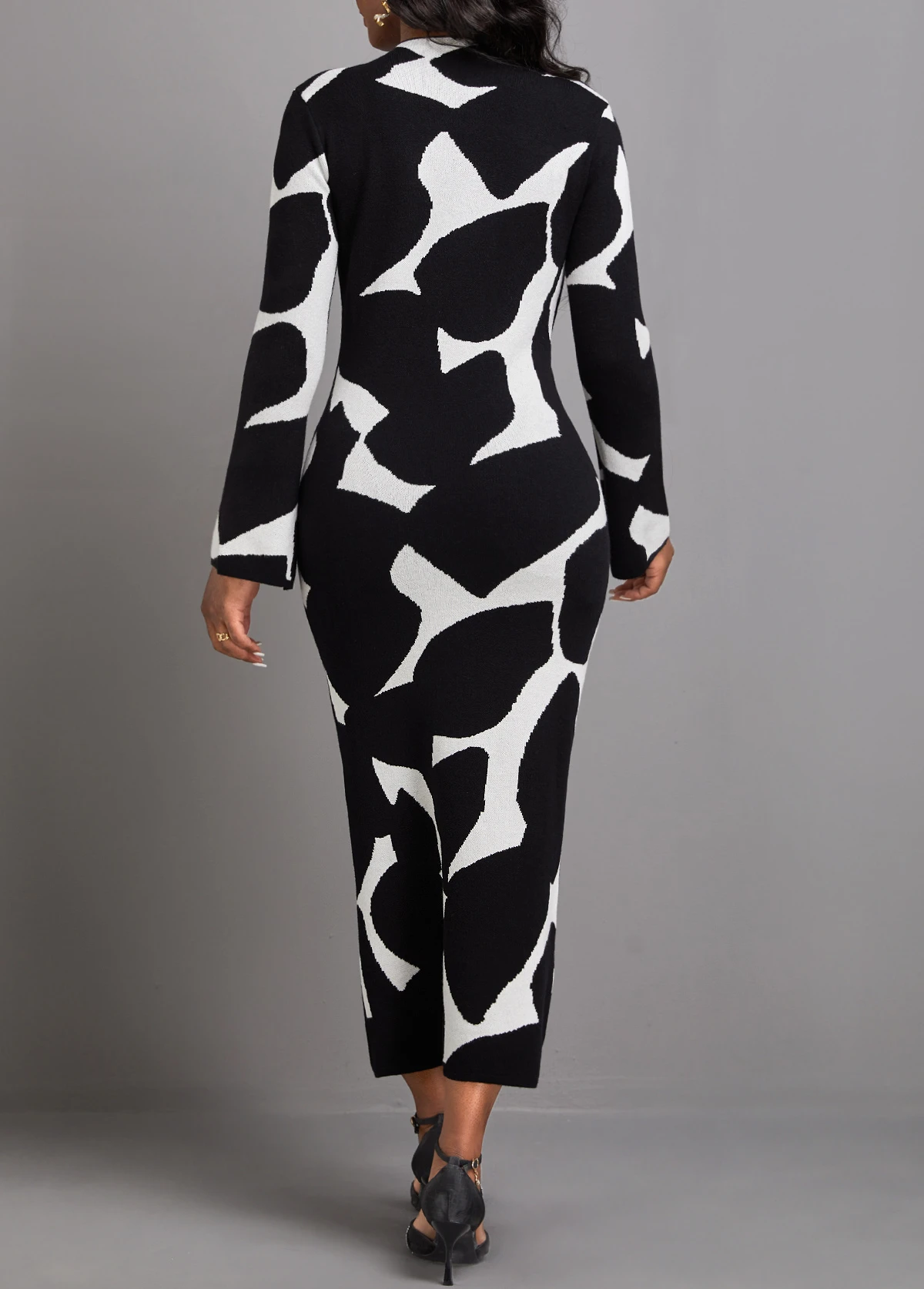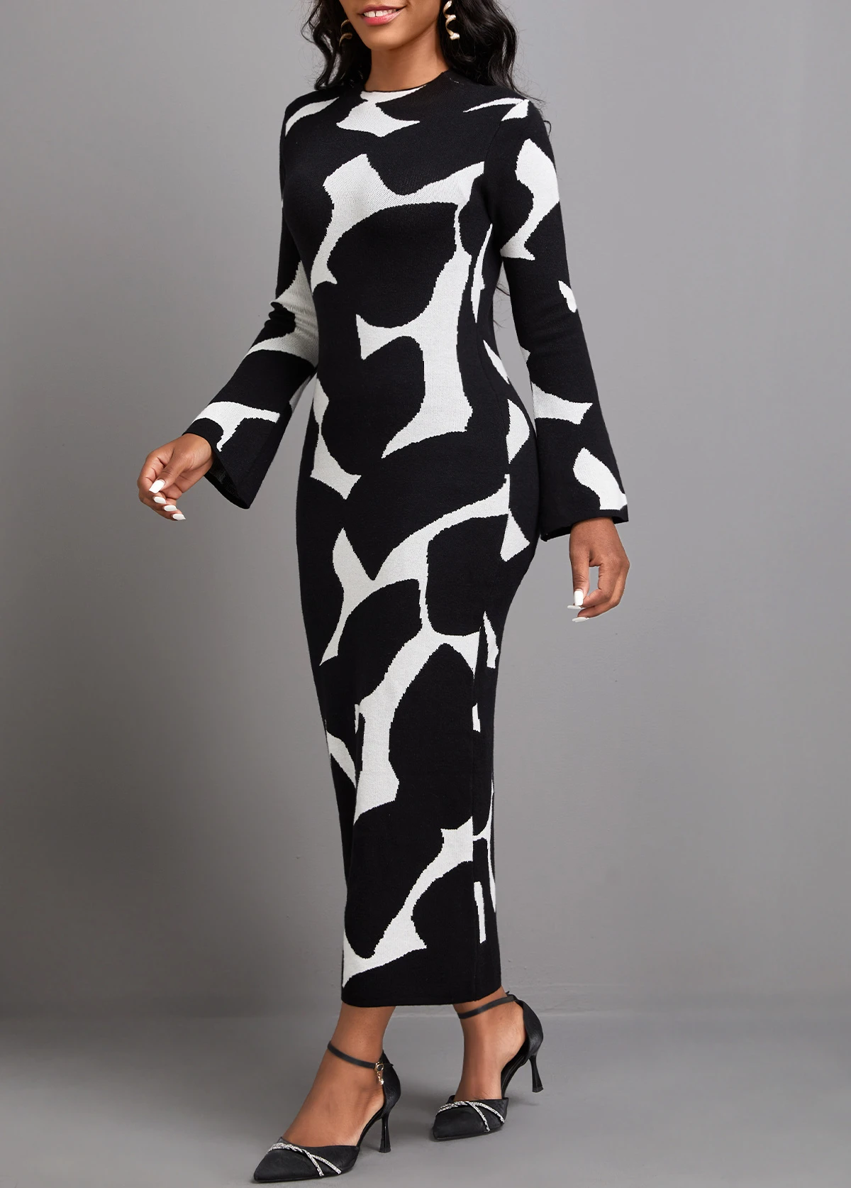 Black Cow Print Long Sleeve Maxi Bodycon Dress