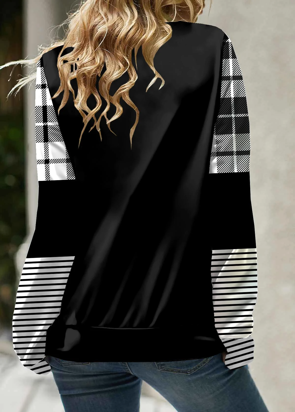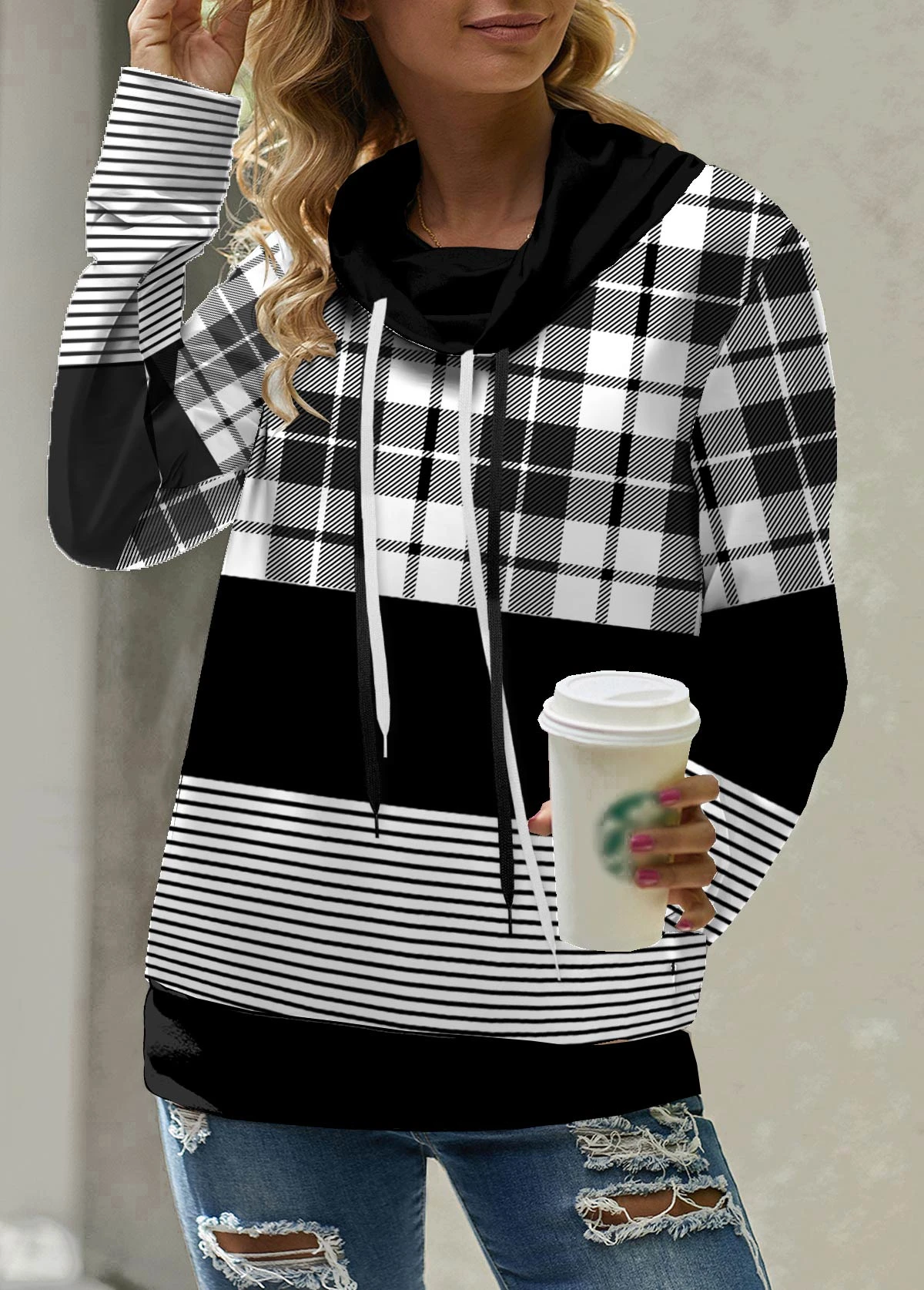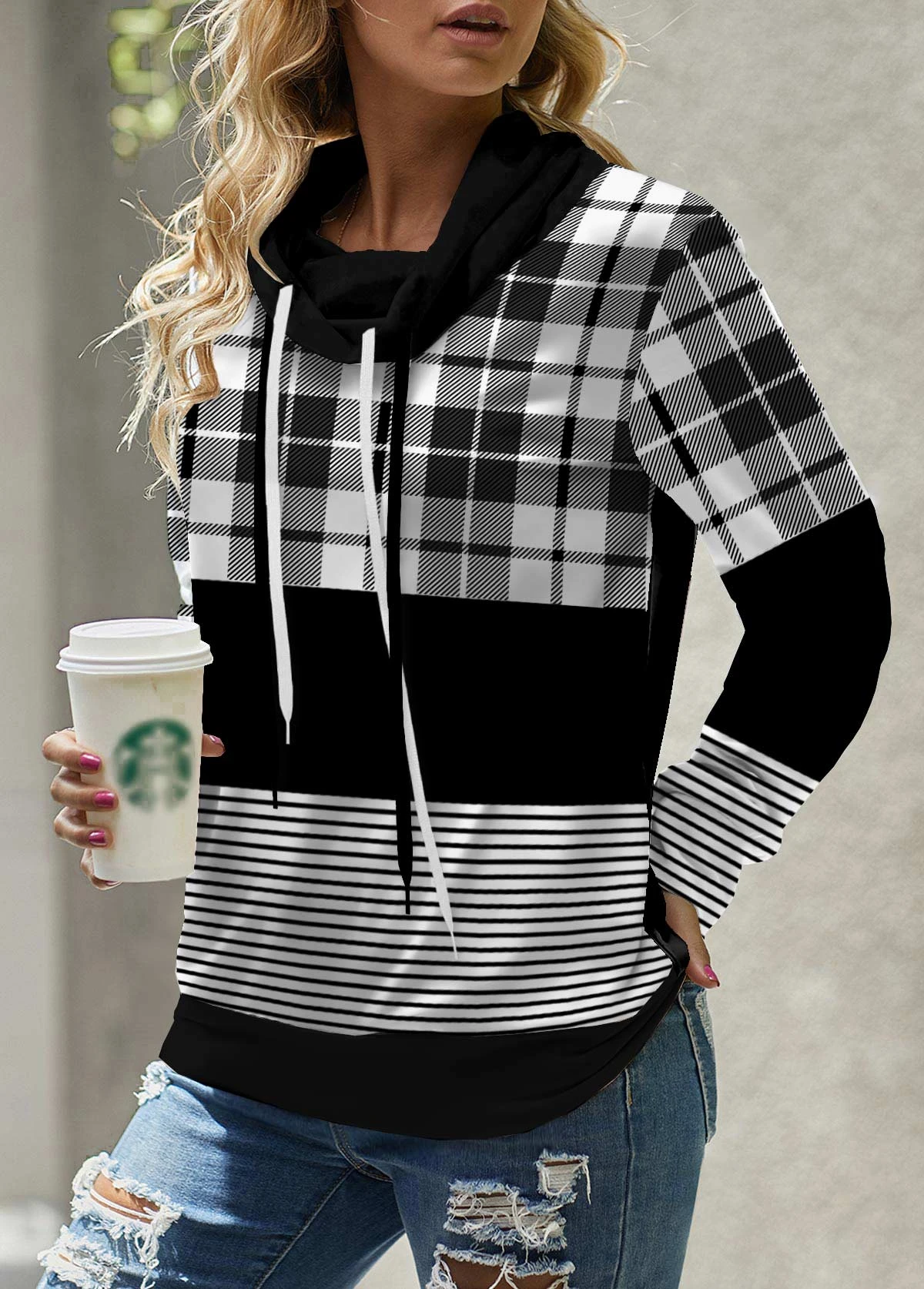 Black Drawstring Plaid Long Sleeve Cowl Neck Sweatshirt