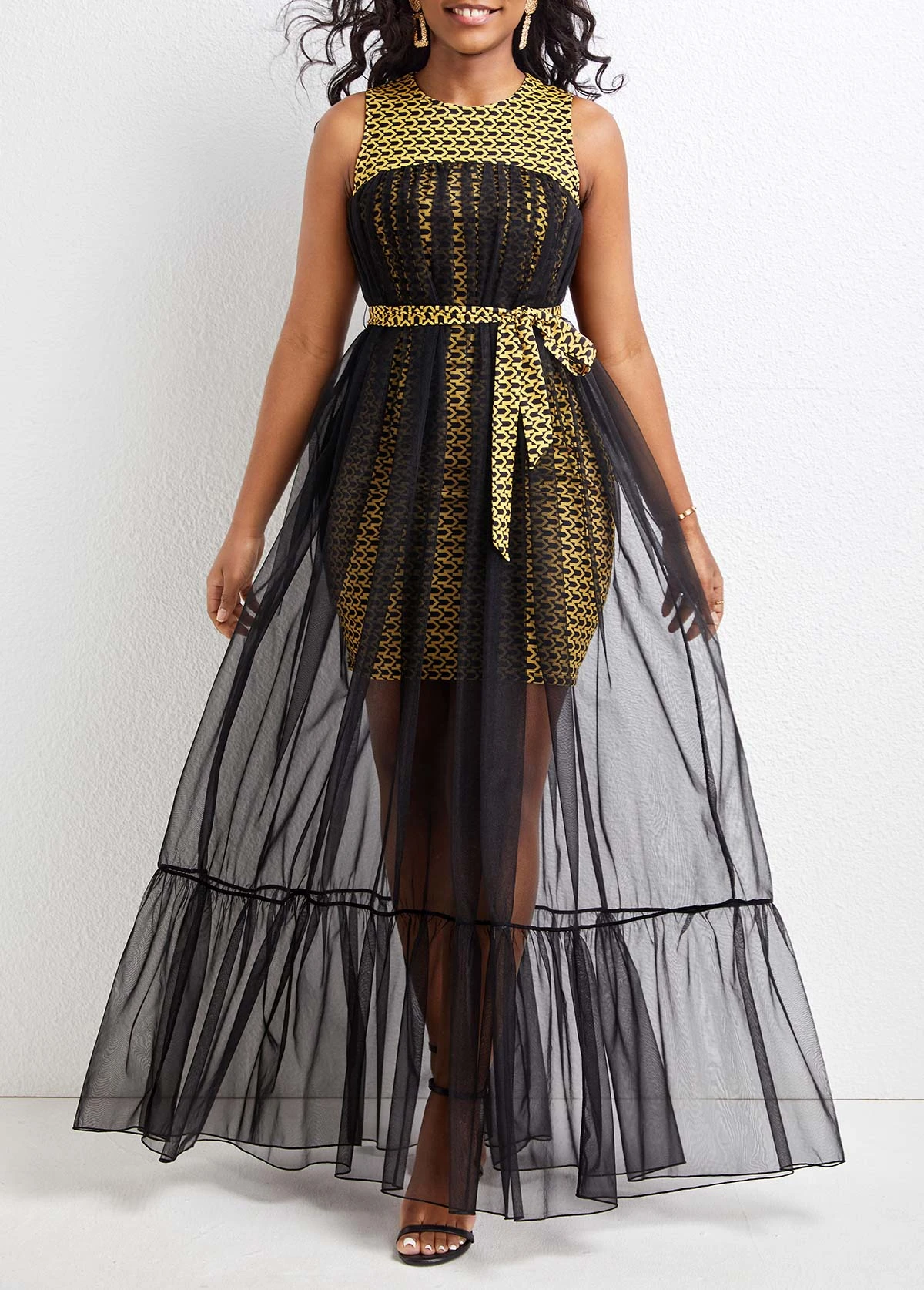 Black Mesh Chevron Print Belted Sleeveless Dress