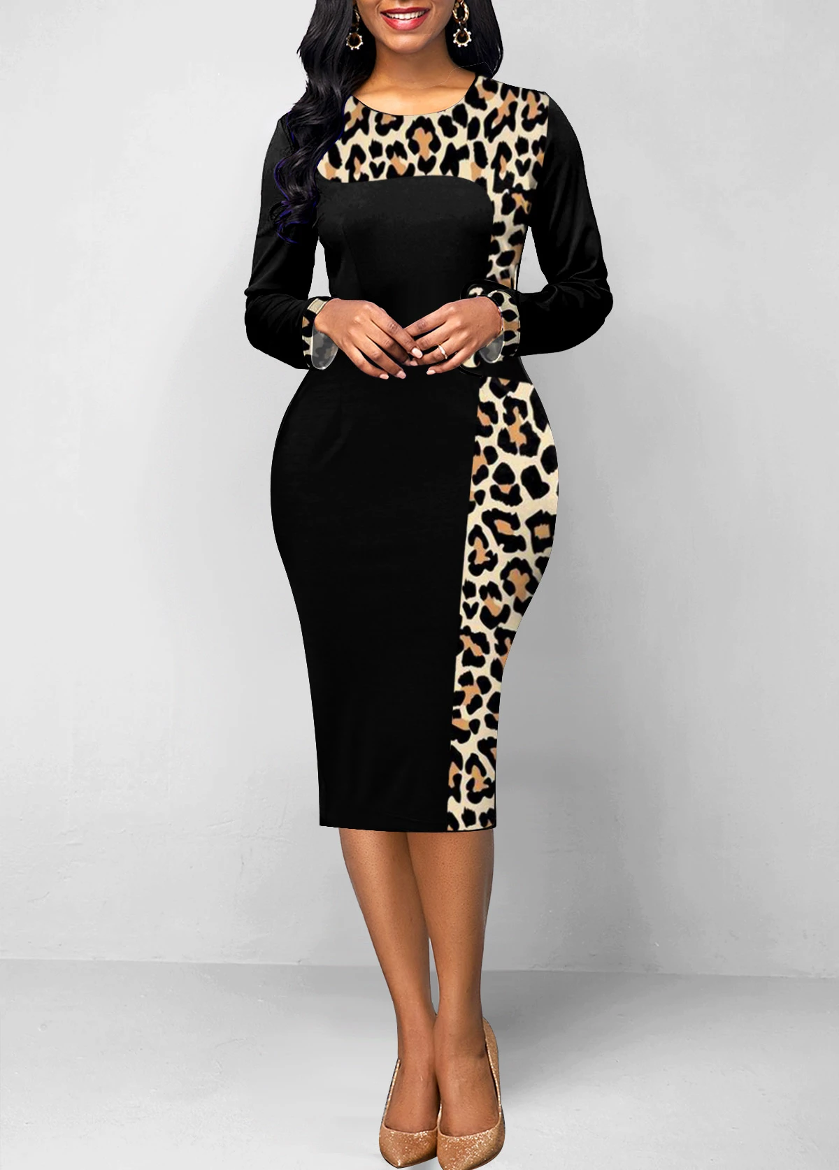 Black Patchwork Leopard Long Sleeve Bodycon Dress