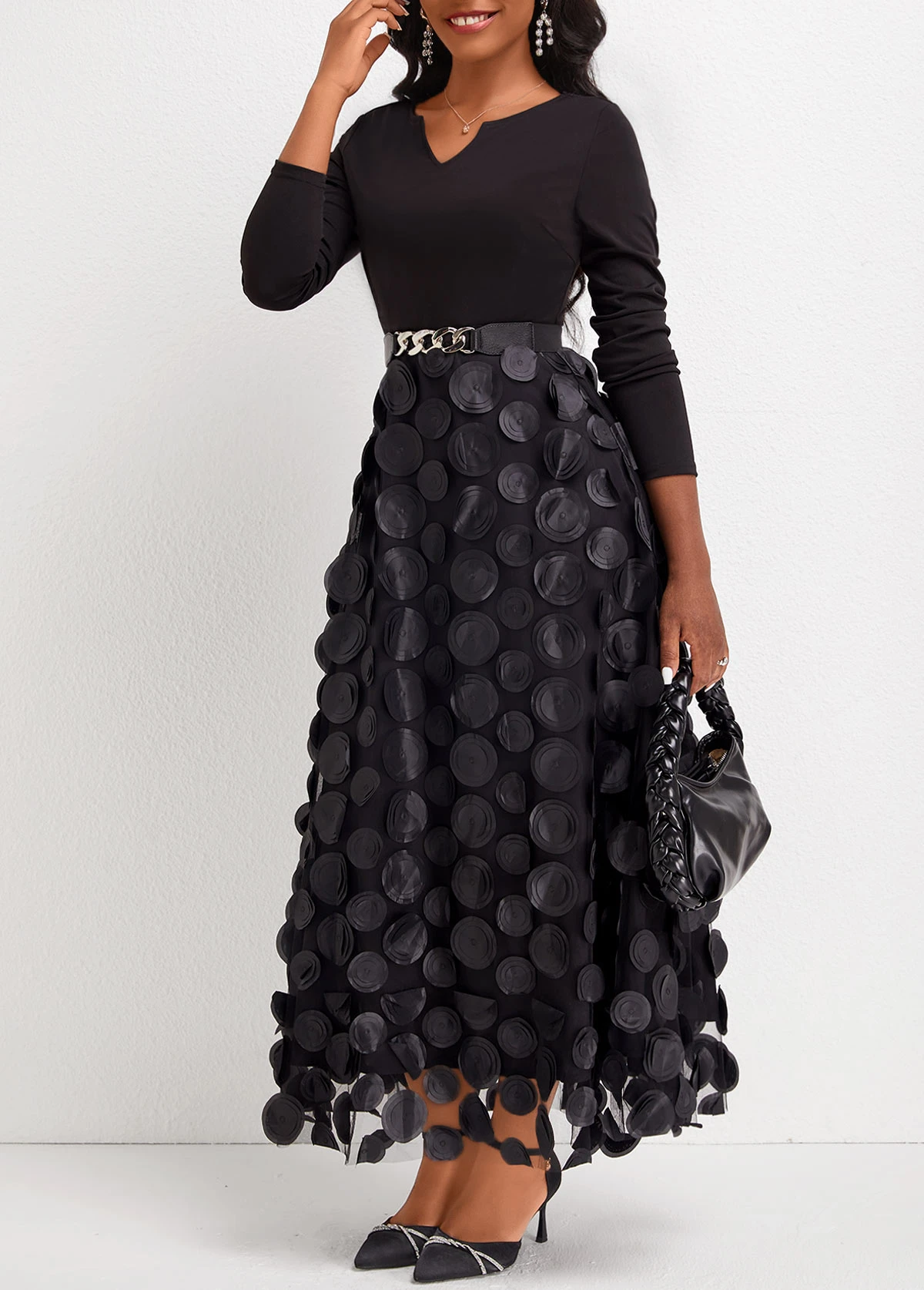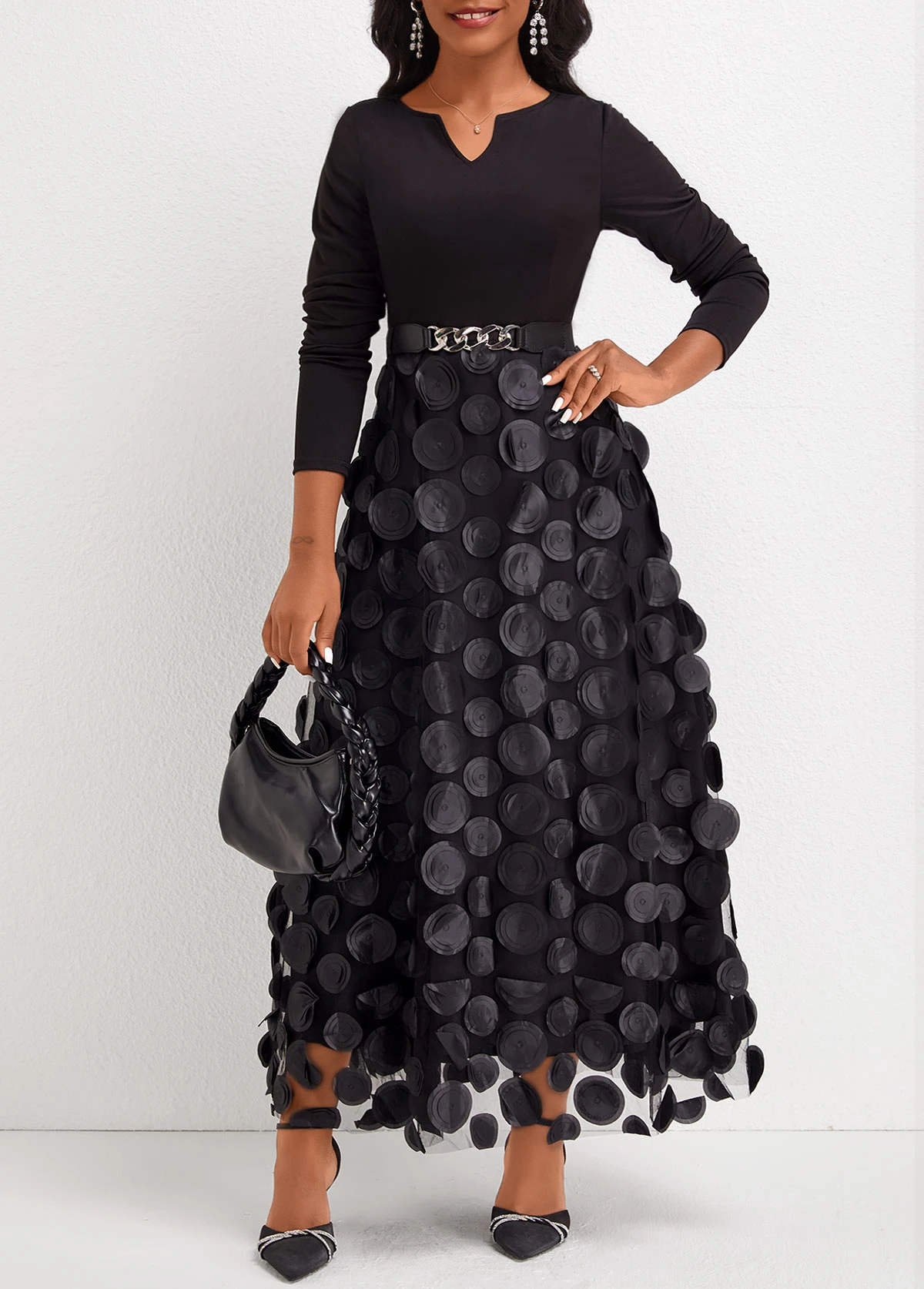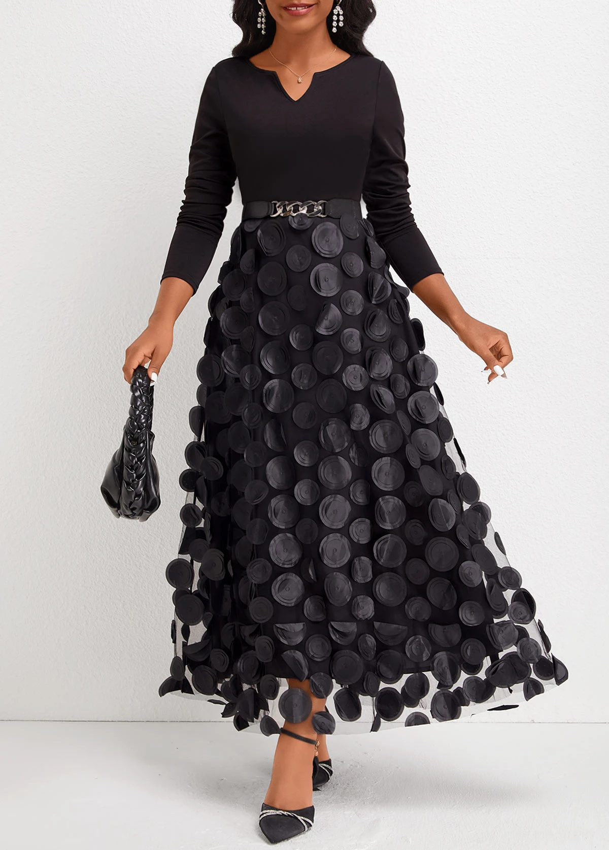 Black Patchwork Long Sleeve Split Neck Maxi Dress
