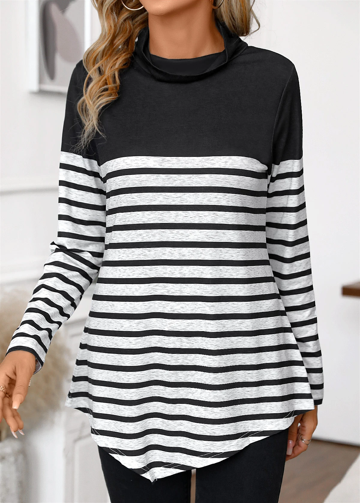 Black Patchwork Striped Long Sleeve High Neck T Shirt