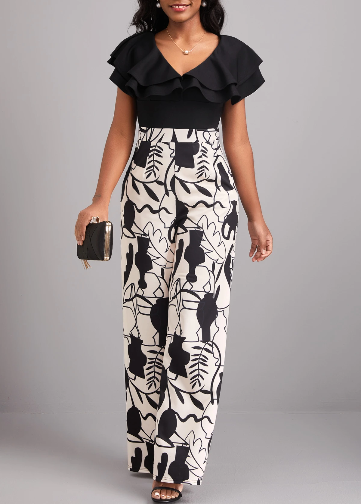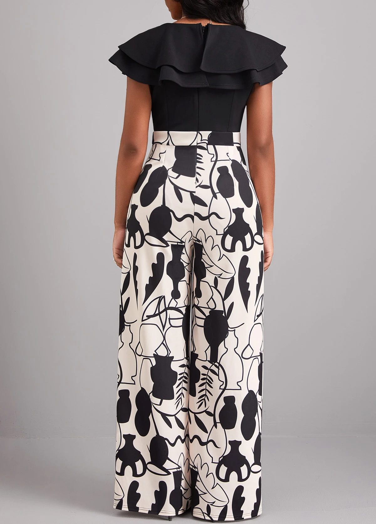 Black Ruffle Leaf Print Sleeveless Jumpsuit