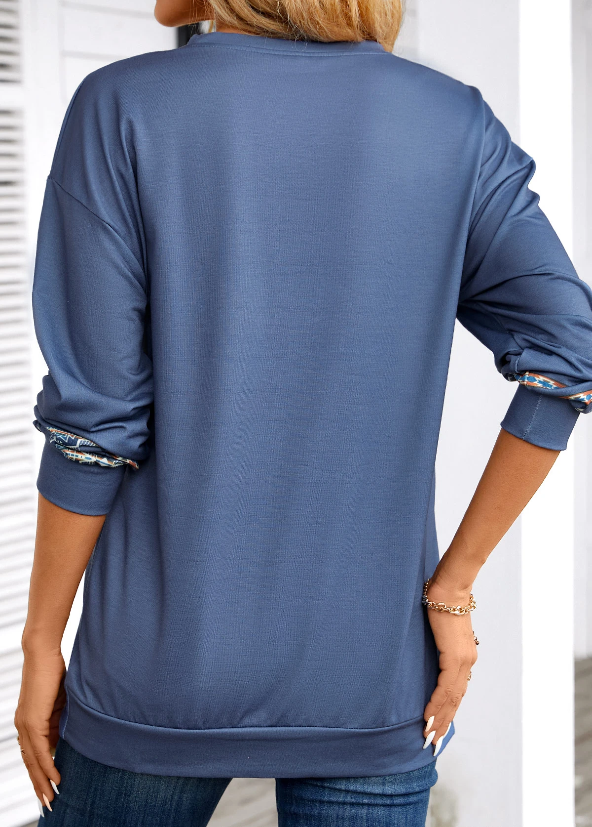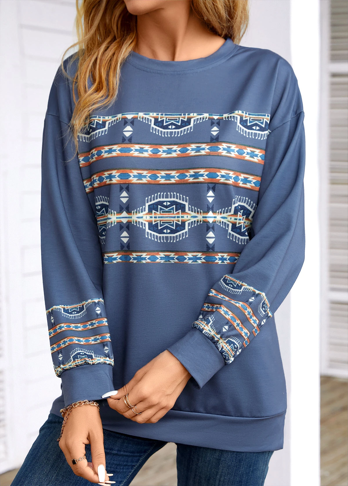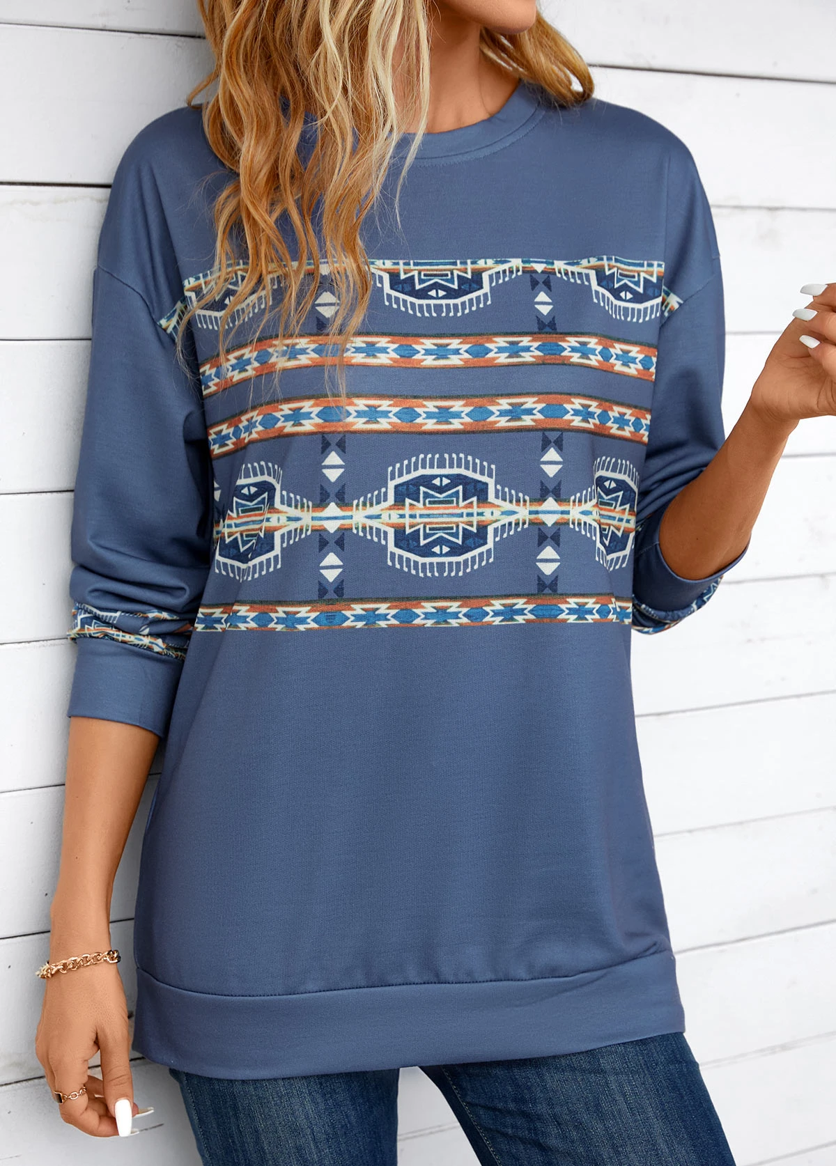 Blue Tribal Print Long Sleeve Round Neck Sweatshirt
