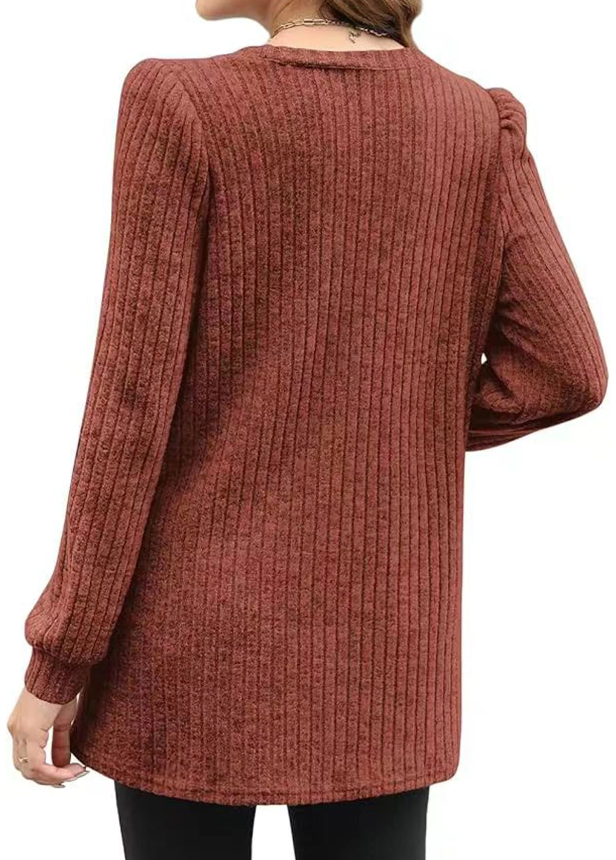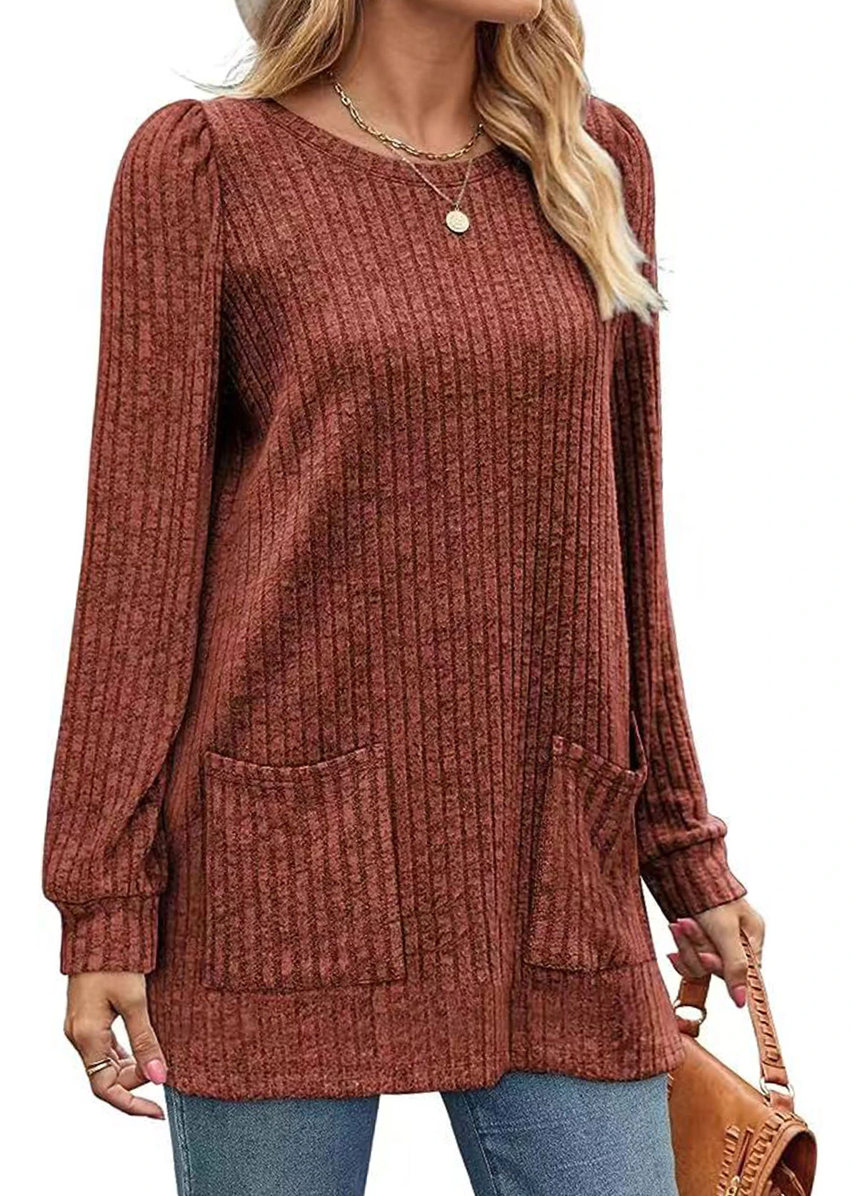 Brick Red Pocket Long Sleeve Round Neck T Shirt