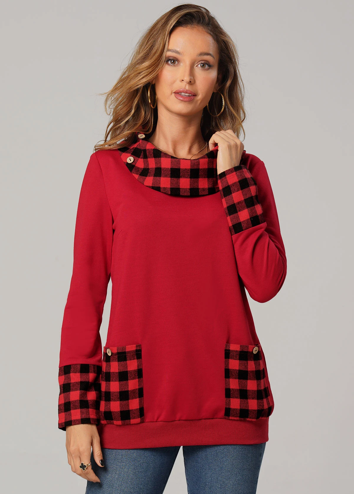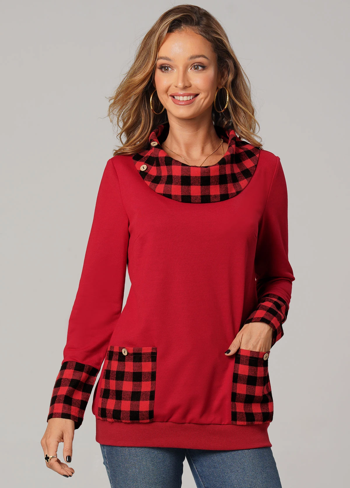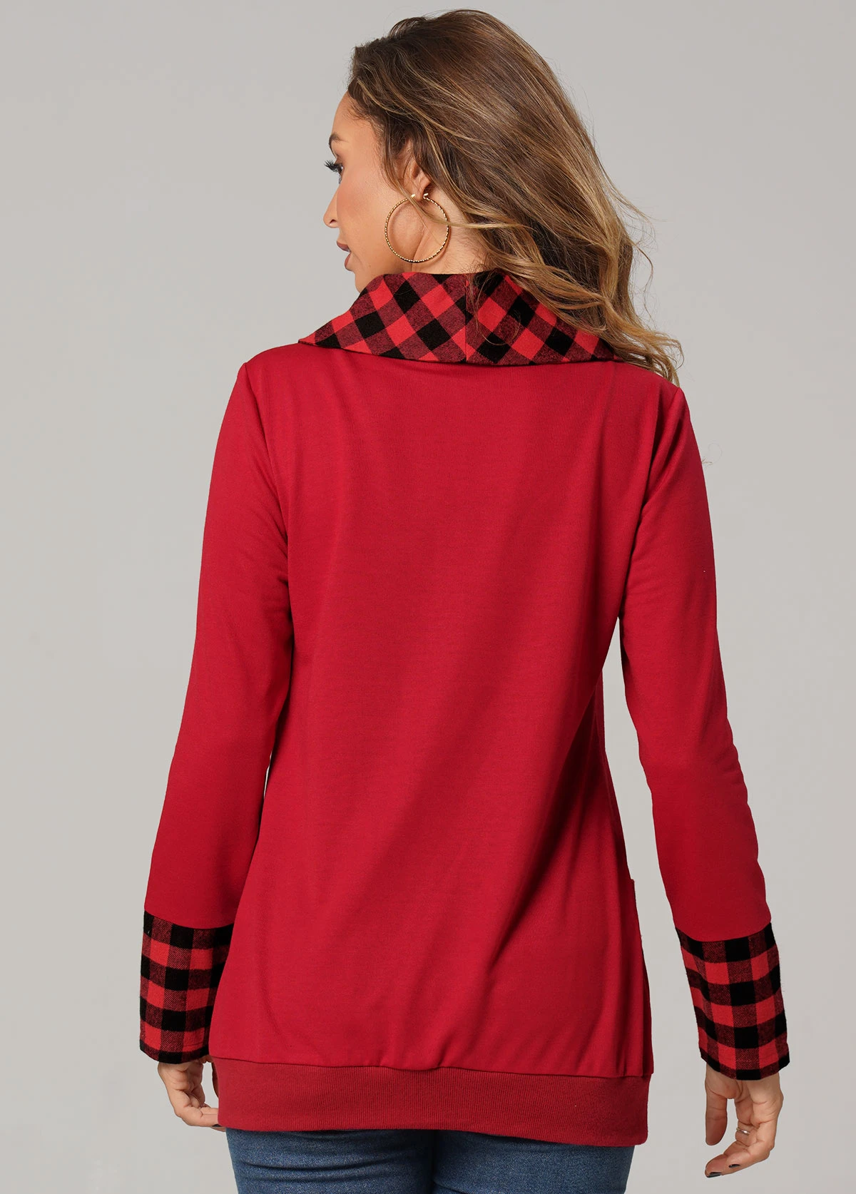 Christmas Plaid Long Sleeve Red Pocket Sweatshirt