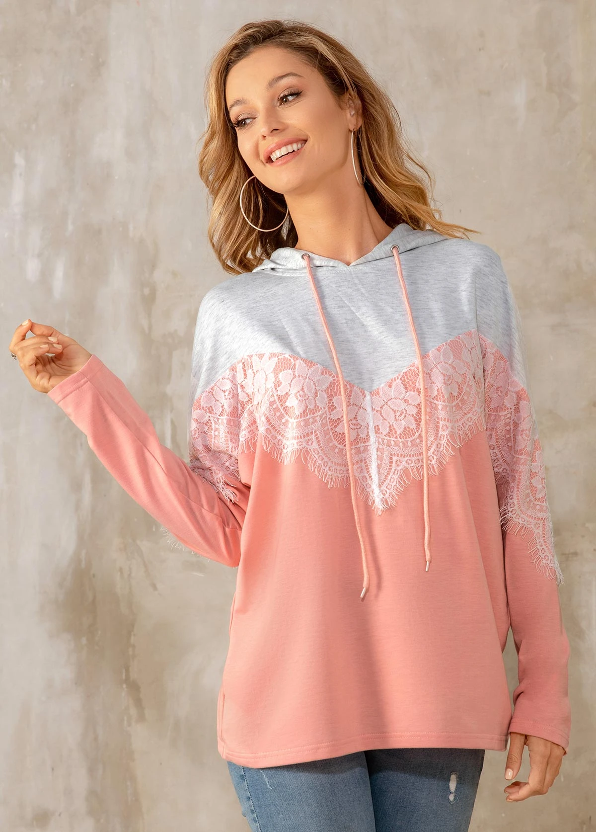 Contrast Lace Stitching Drawstring Detail Hoodie