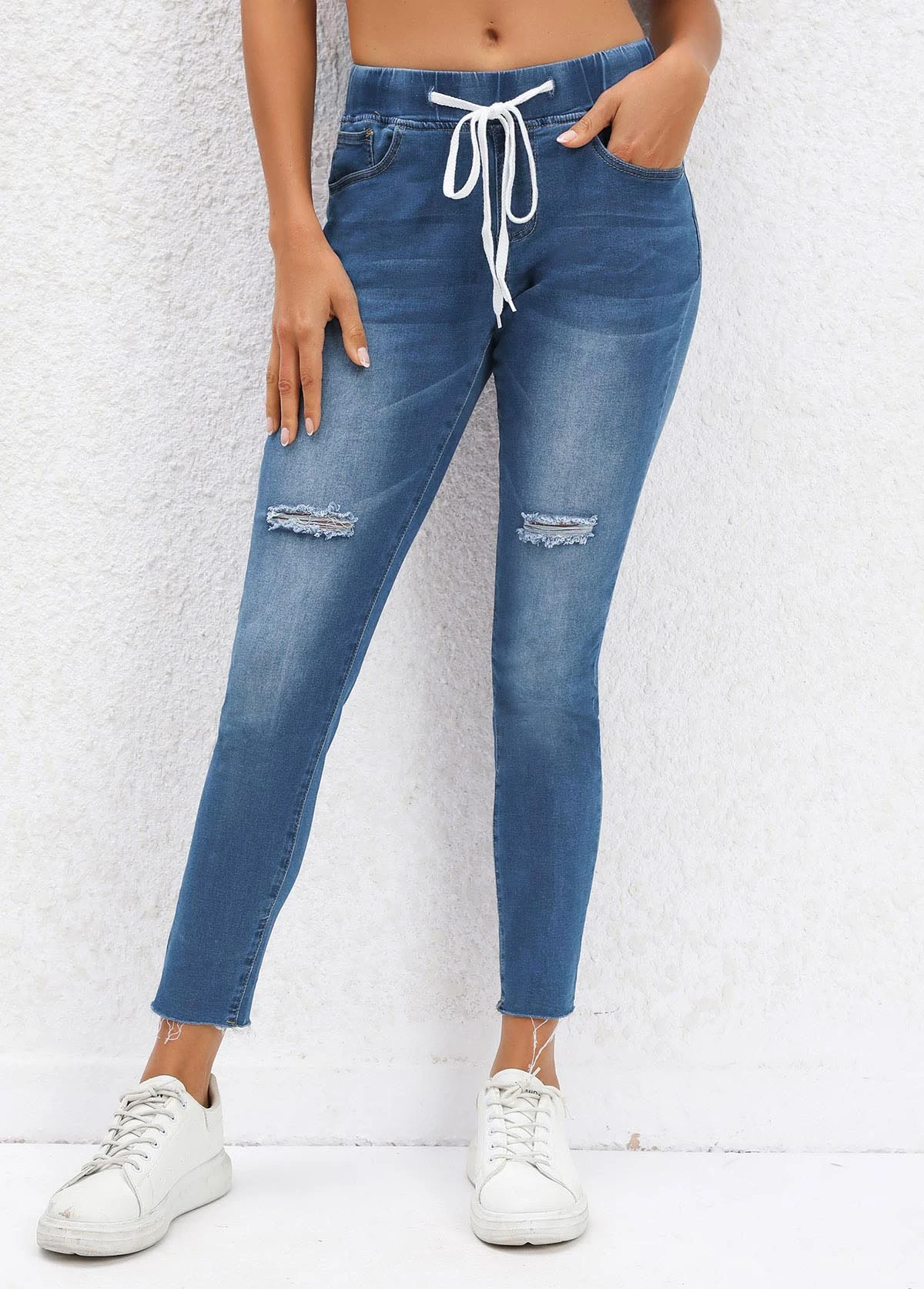 Dark Blue Pocket Skinny Drawastring Mid Waisted Jeans
