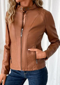 Dark Camel Pocket Long Sleeve High Neck Coat
