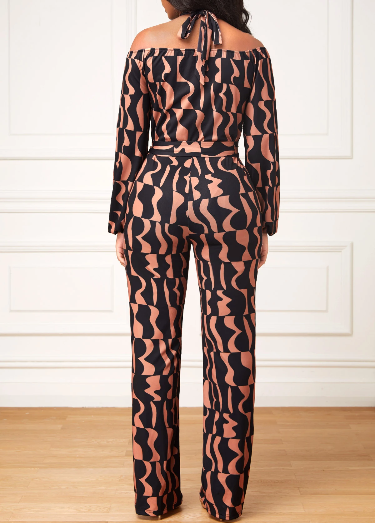 Dark Coffee Cut Out Geometric Print Belted Jumpsuit