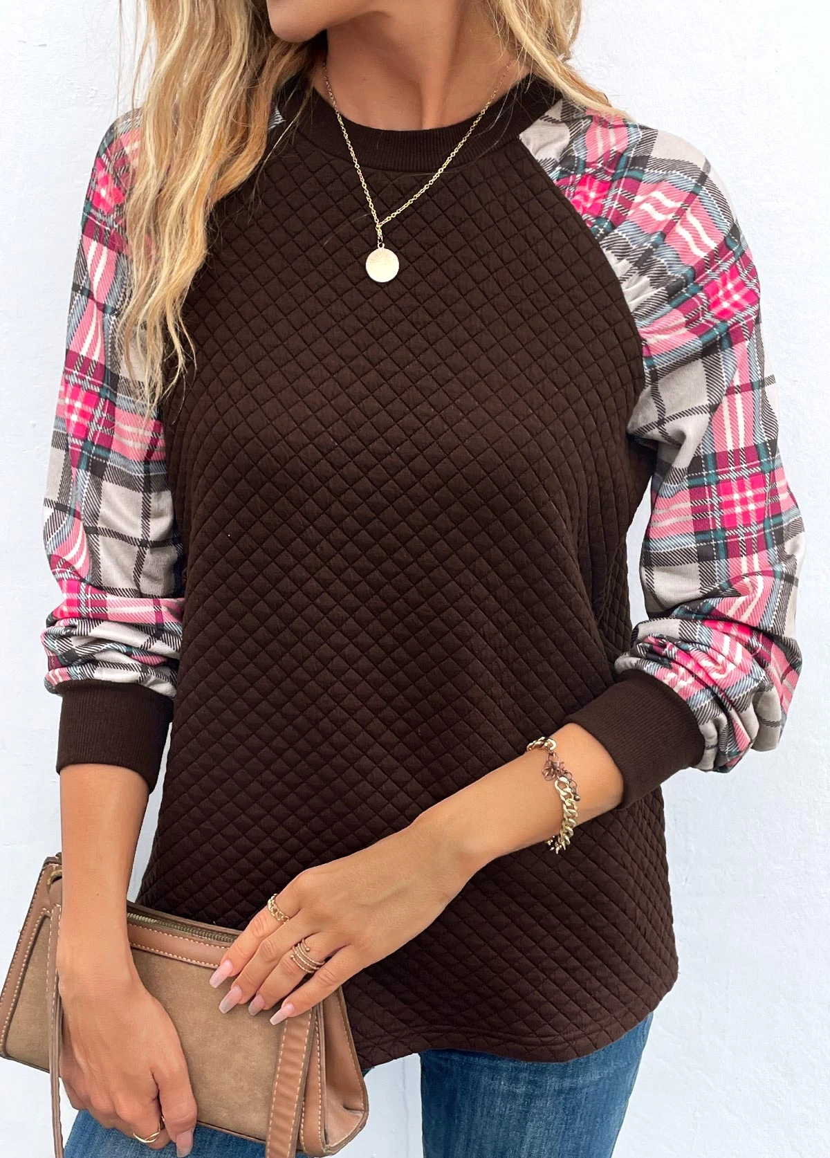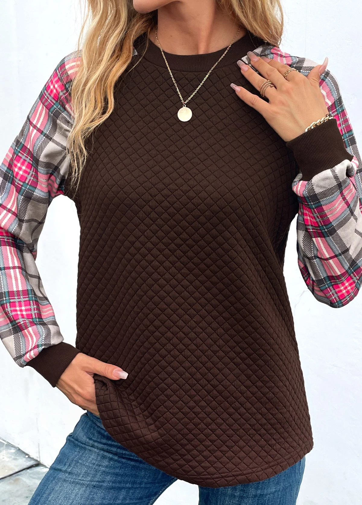 Dark Coffee Patchwork Plaid Long Sleeve Round Neck Sweatshirt