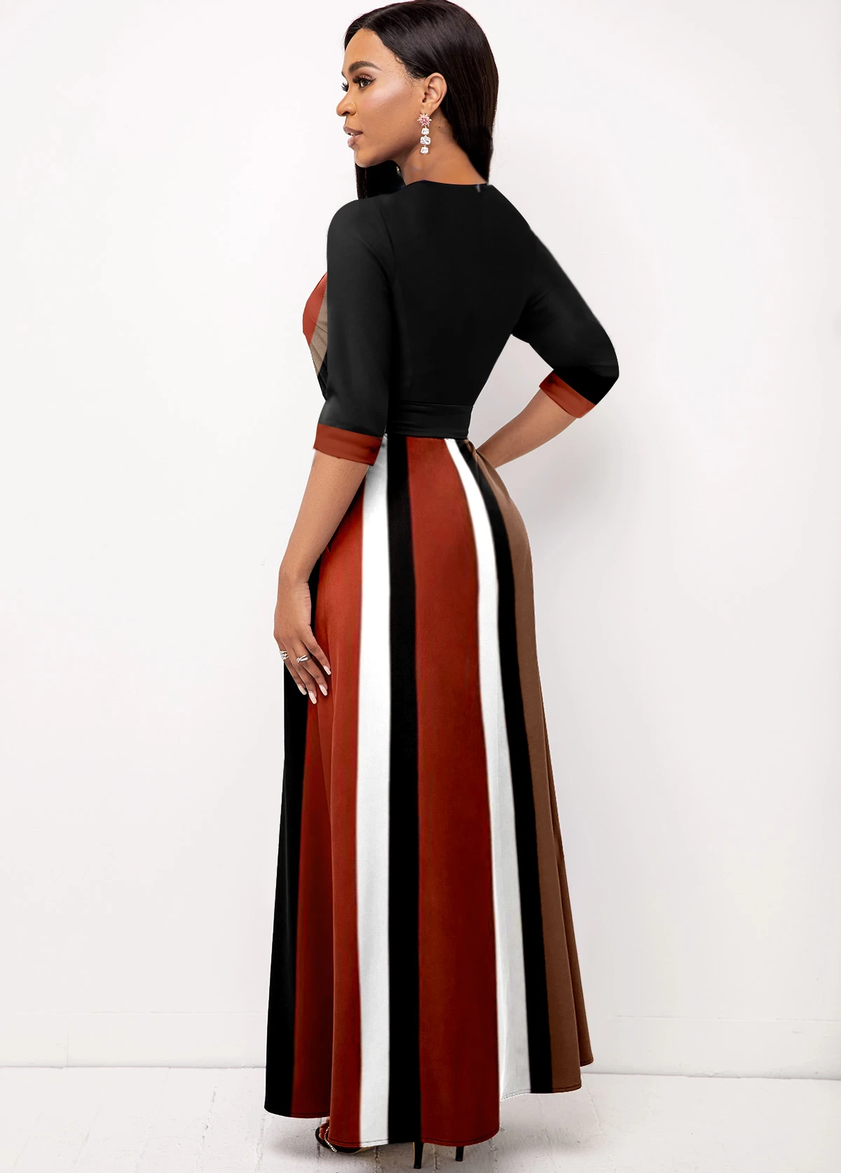 Be the first to review “Dark Coffee Surplice Striped Belted Dress” Cancel reply