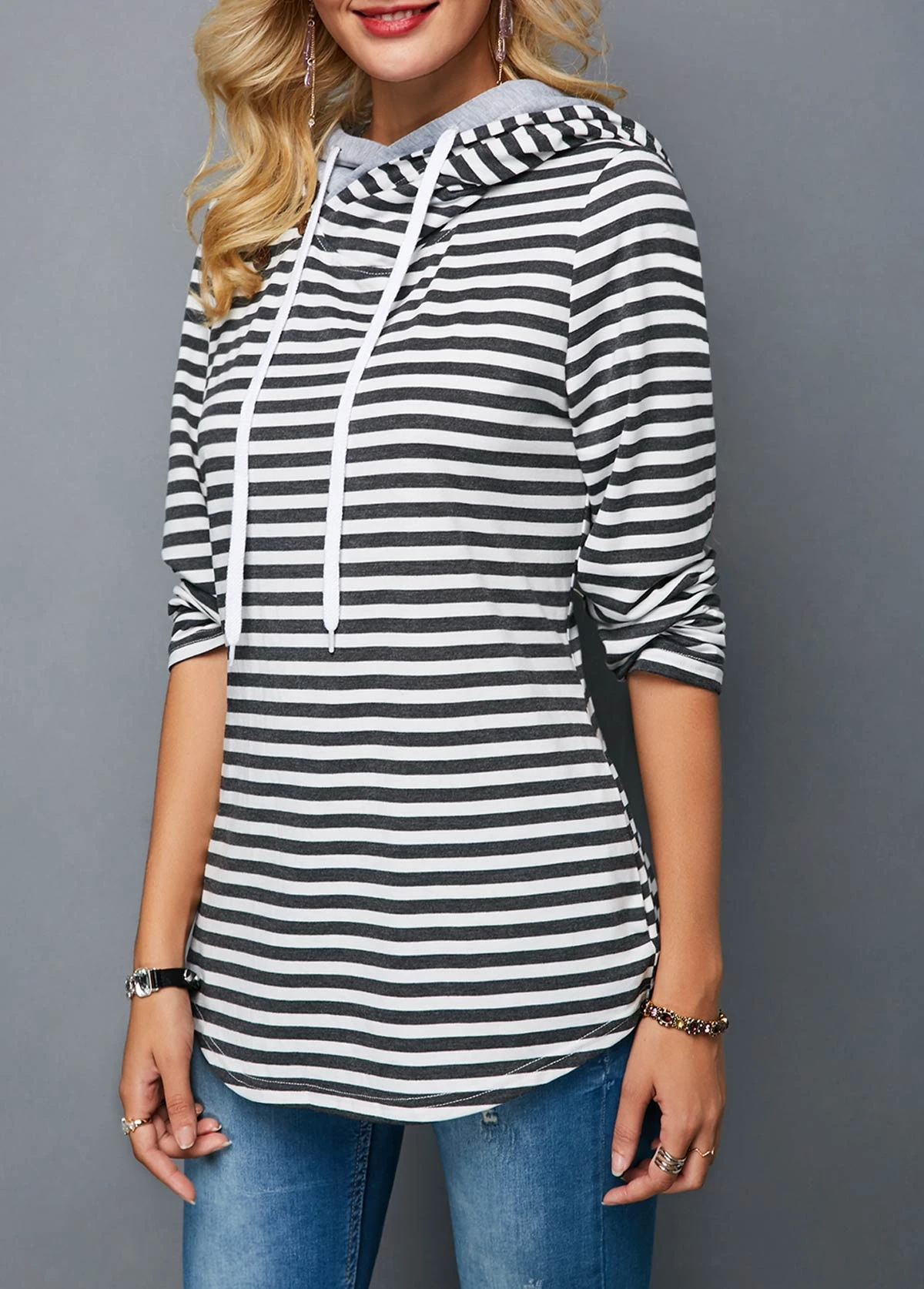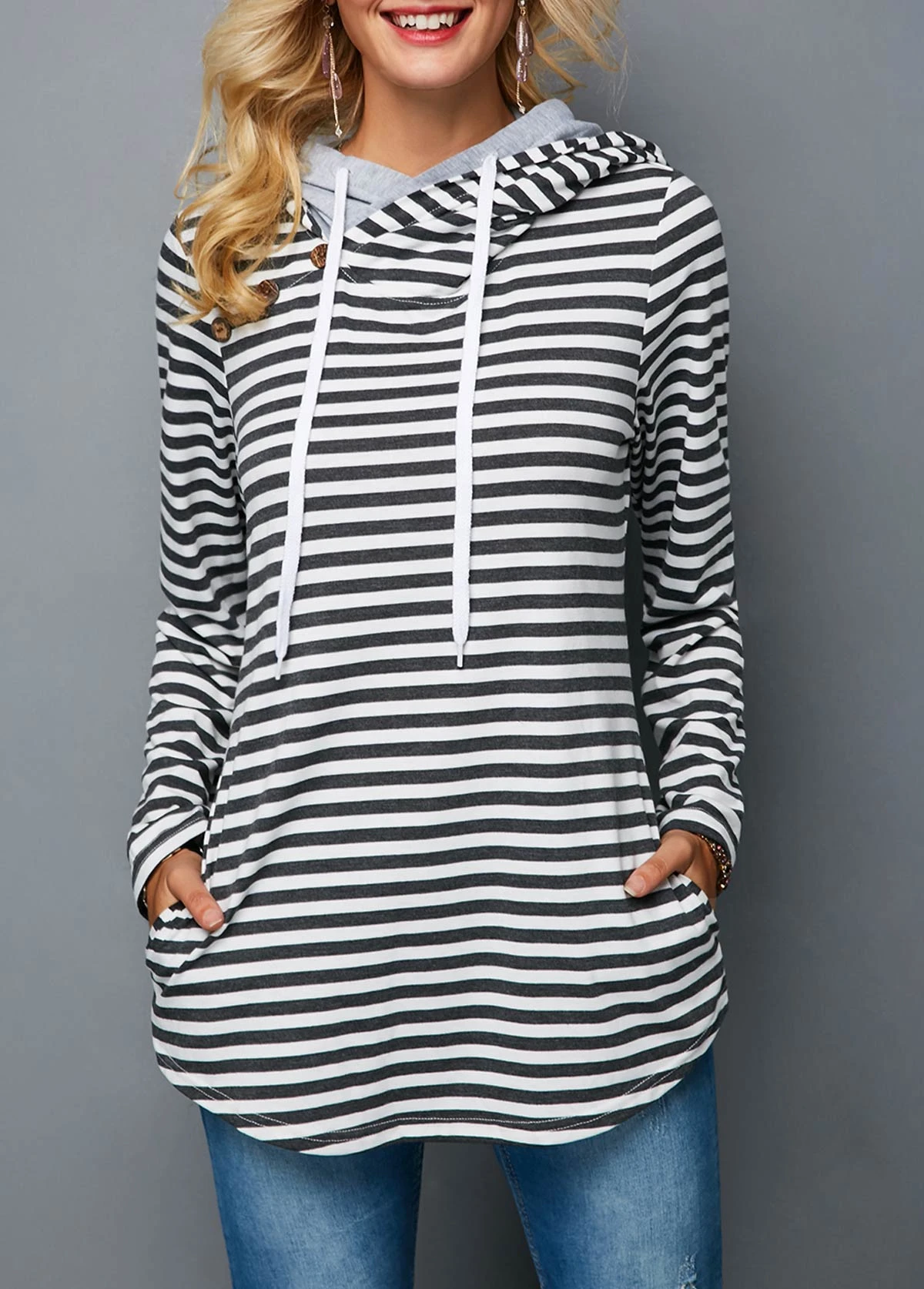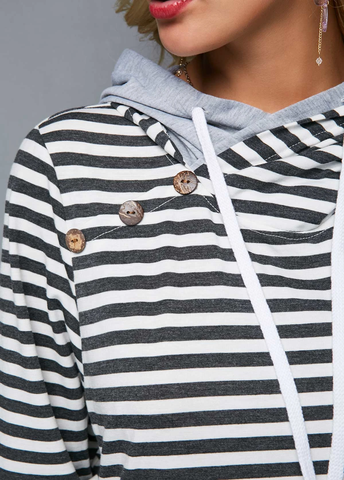 Decorative Button Stripe Print Long Sleeve Hoodie