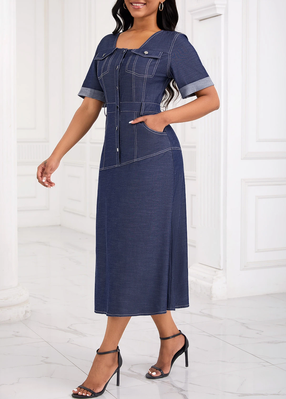 Denim Blue Pocket Button Detail Short Sleeve Dress