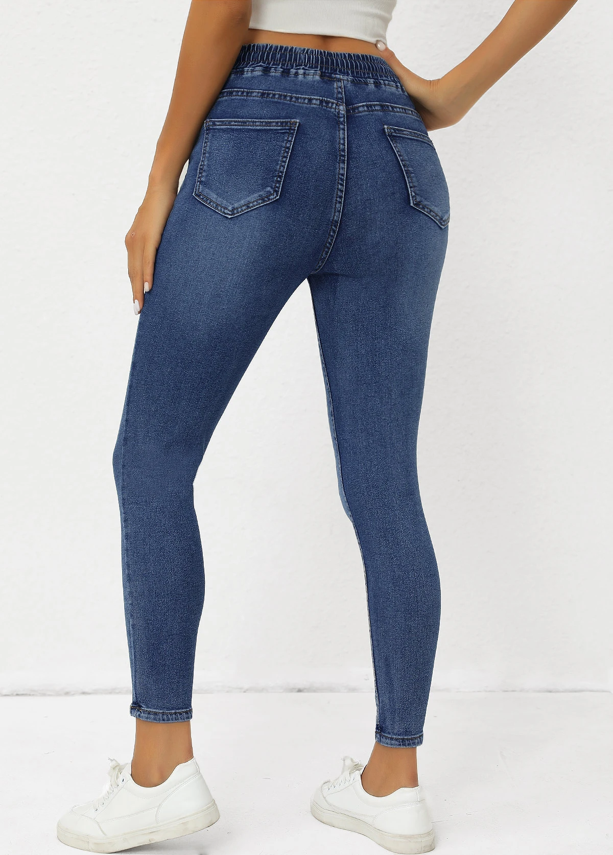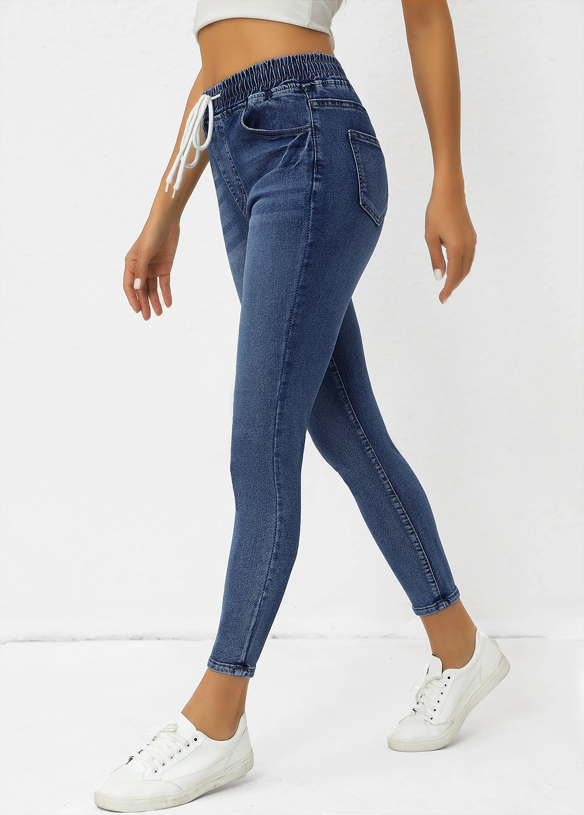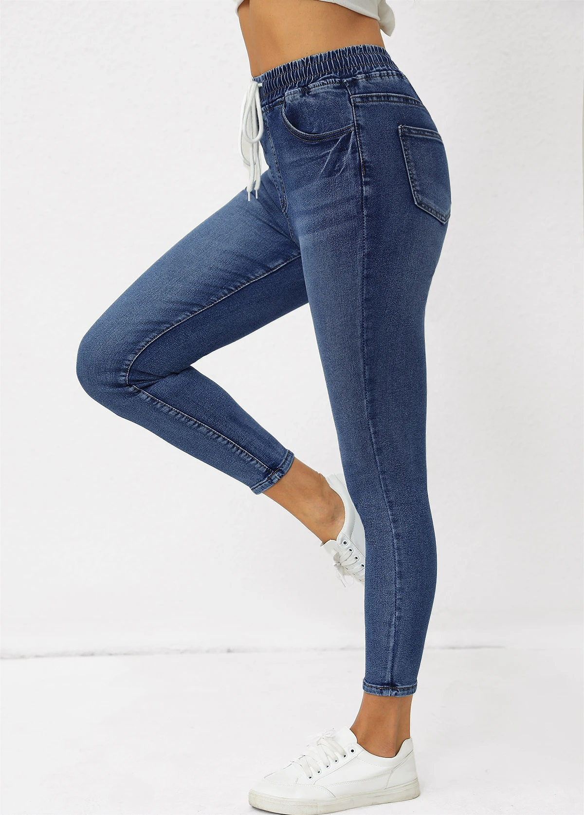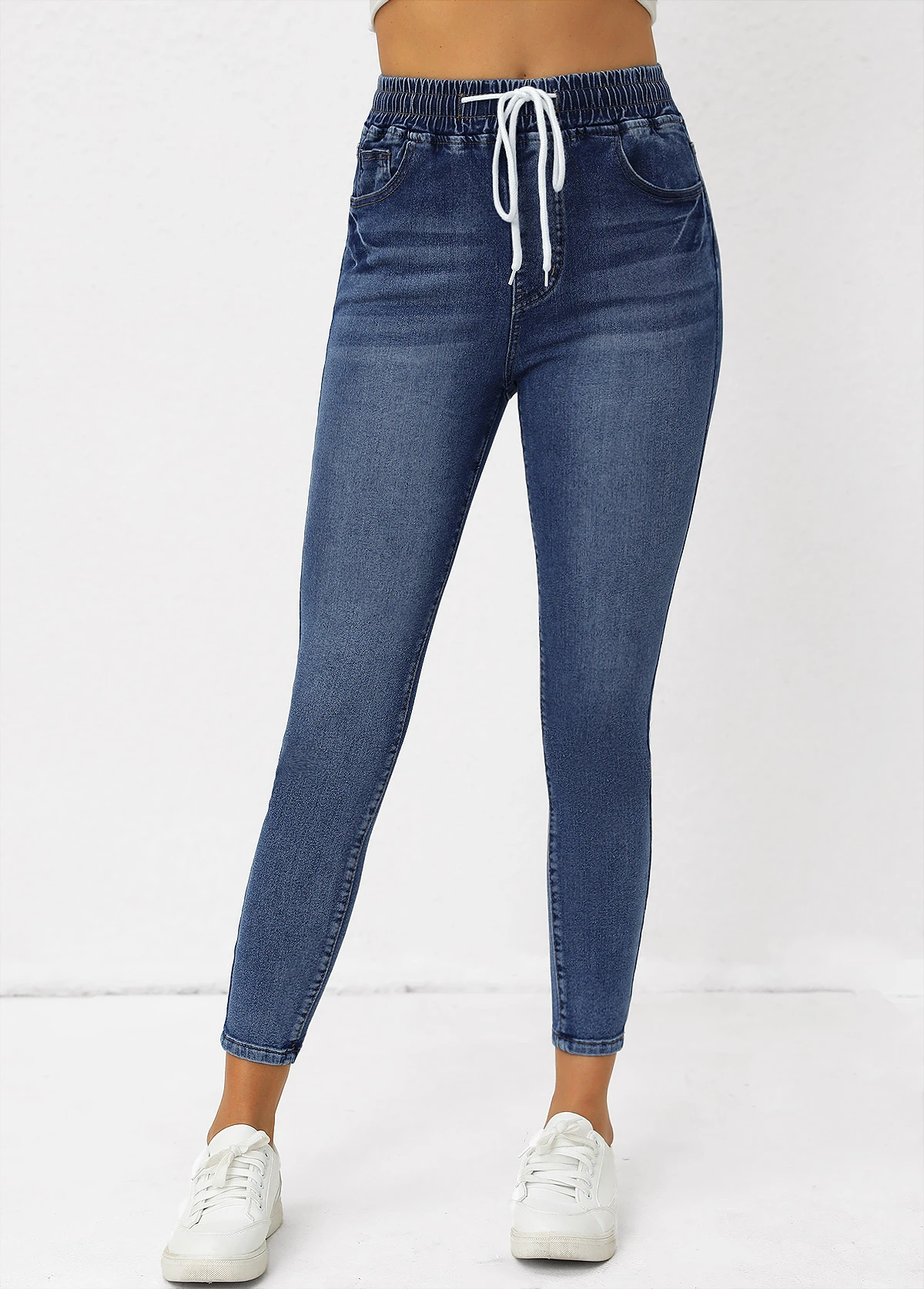 Denim Blue Pocket Skinny Drawastring High Waisted Jeans