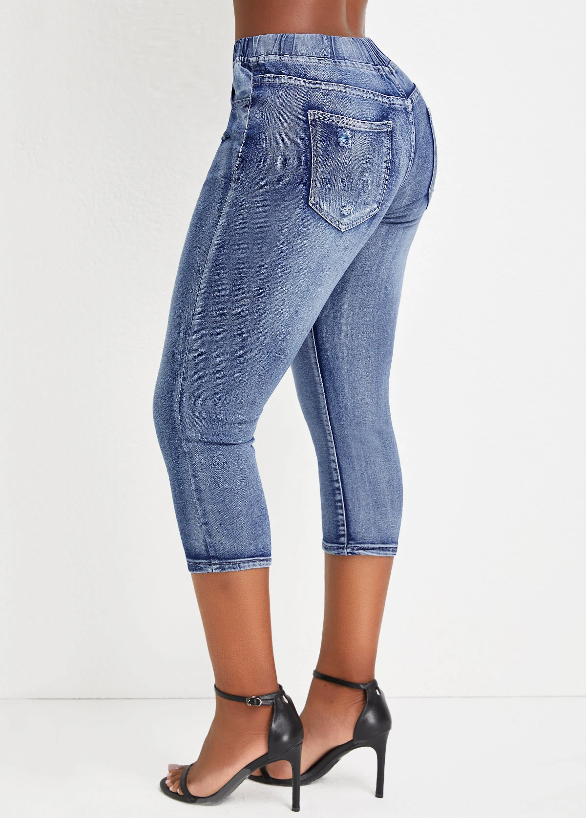 Denim Blue Pocket Skinny Drawastring Mid Waisted Jeans