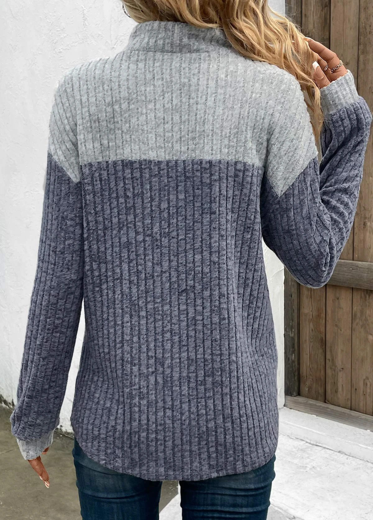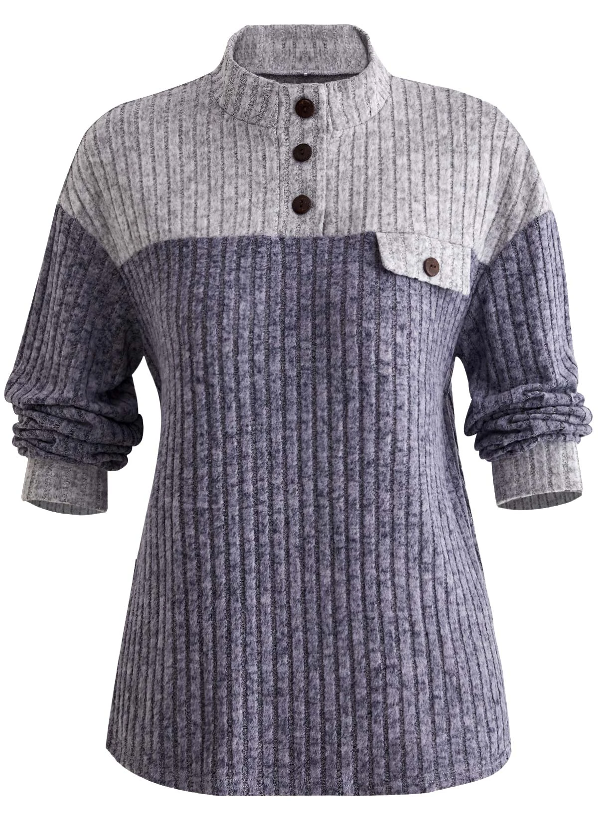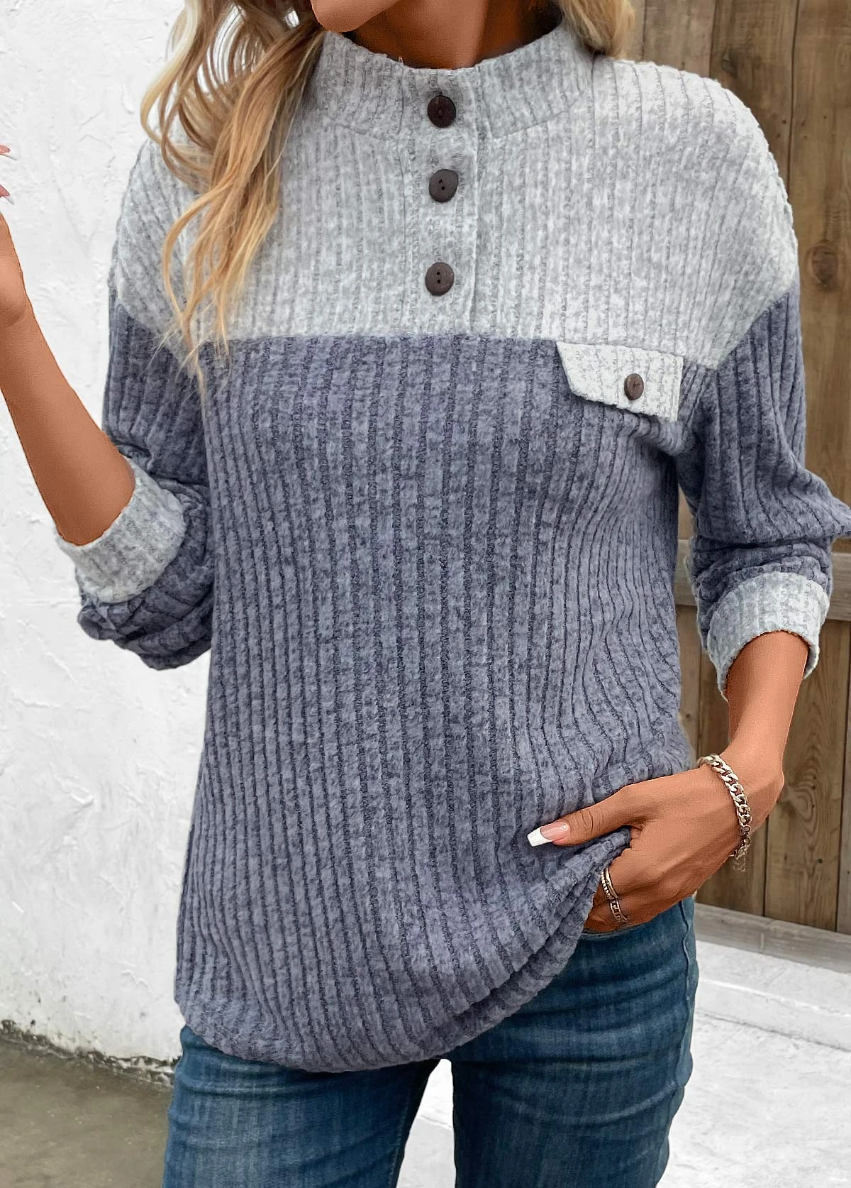 Dusty Blue Patchwork Long Sleeve Stand Collar Sweatshirt