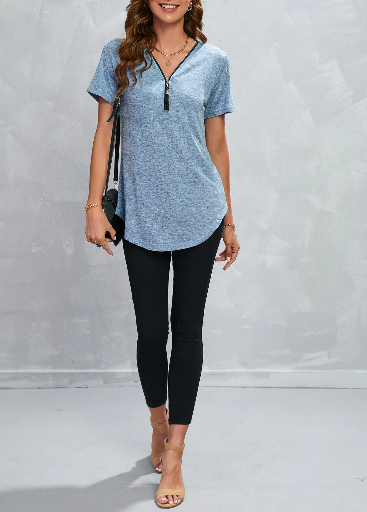 Be the first to review “Dusty Blue Zipper Short Sleeve T Shirt” Cancel reply
