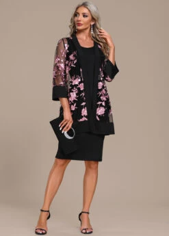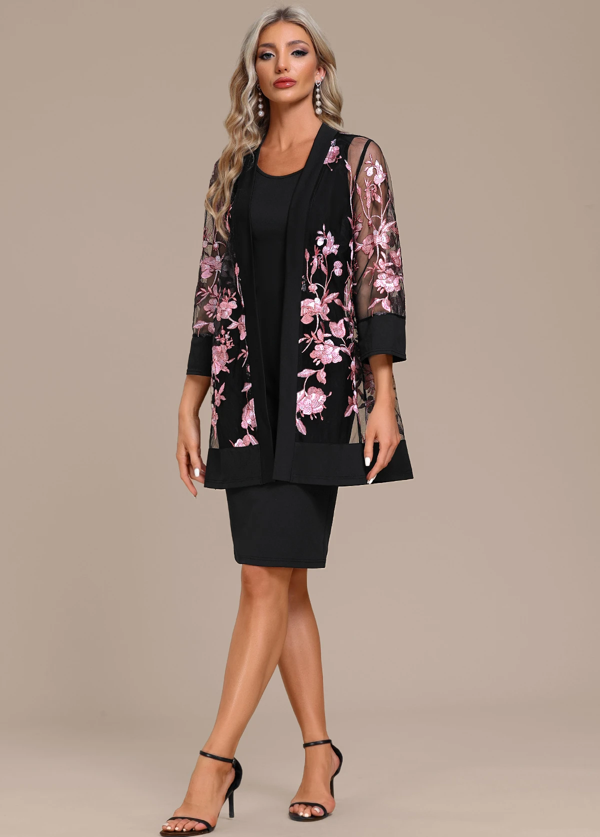 Embroidery Black Two Piece Shift Dress And Cardigan