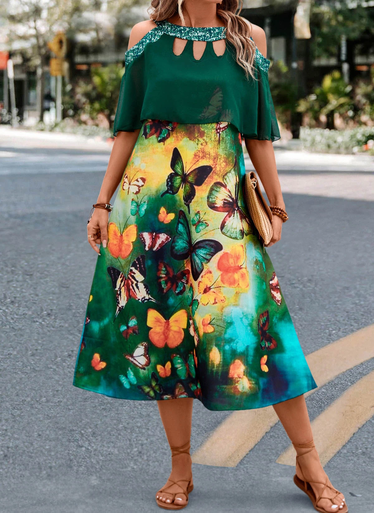 Be the first to review “Green Cage Neck Butterfly Print A Line Dress” Cancel reply