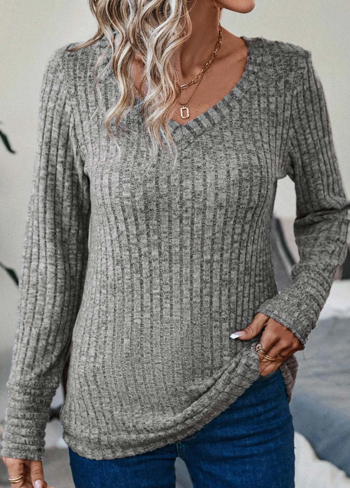 Grey Long Sleeve V Neck T Shirt