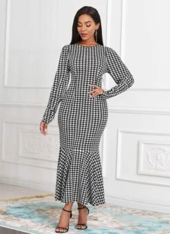 Houndstooth Print Long Sleeve Round Neck Mermaid Dress