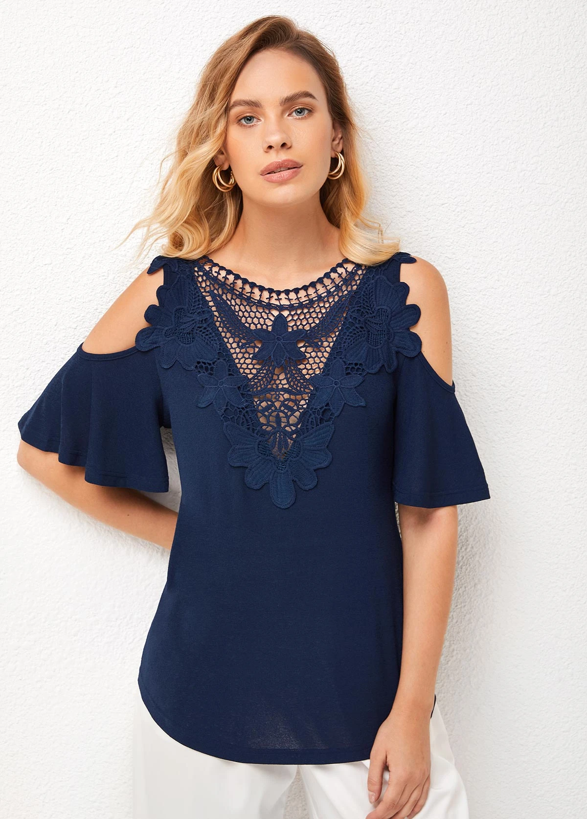 Be the first to review “Lace Stitching Cold Shoulder Cross Strap T Shirt” Cancel reply