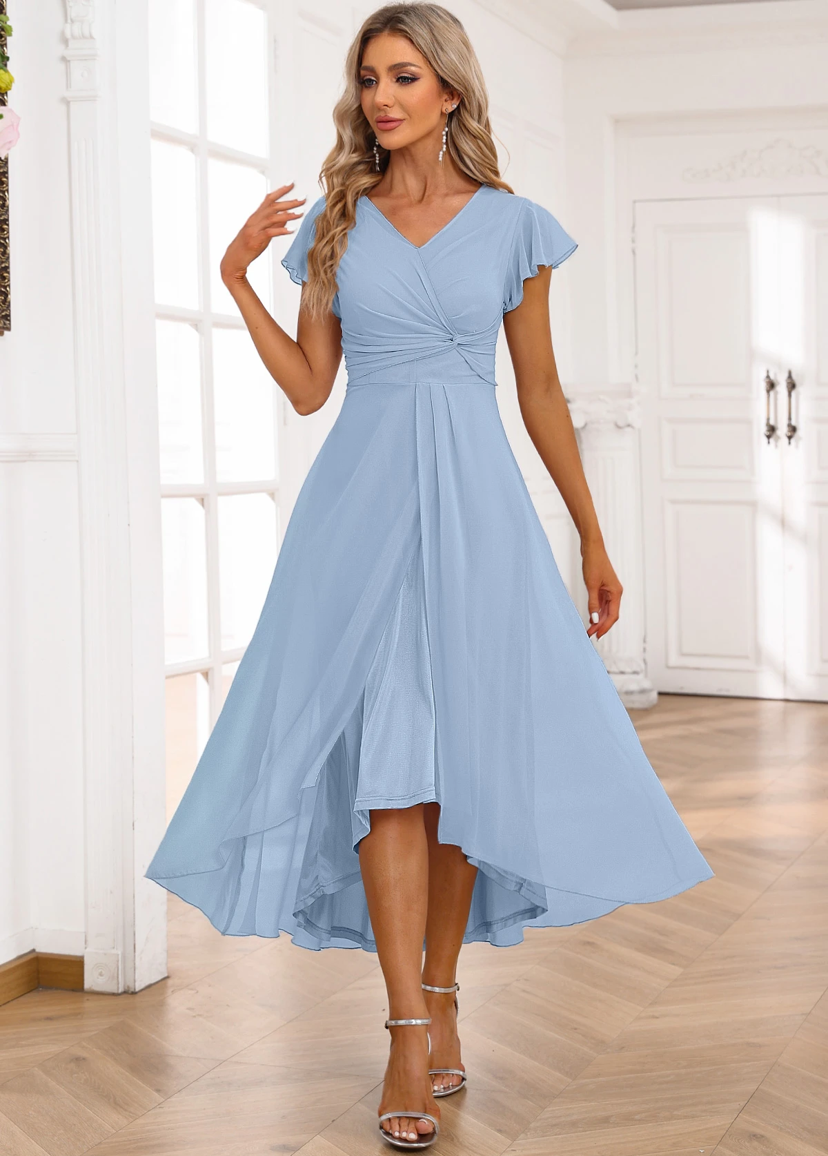 Light Blue Twist High Low Short Sleeve Dress