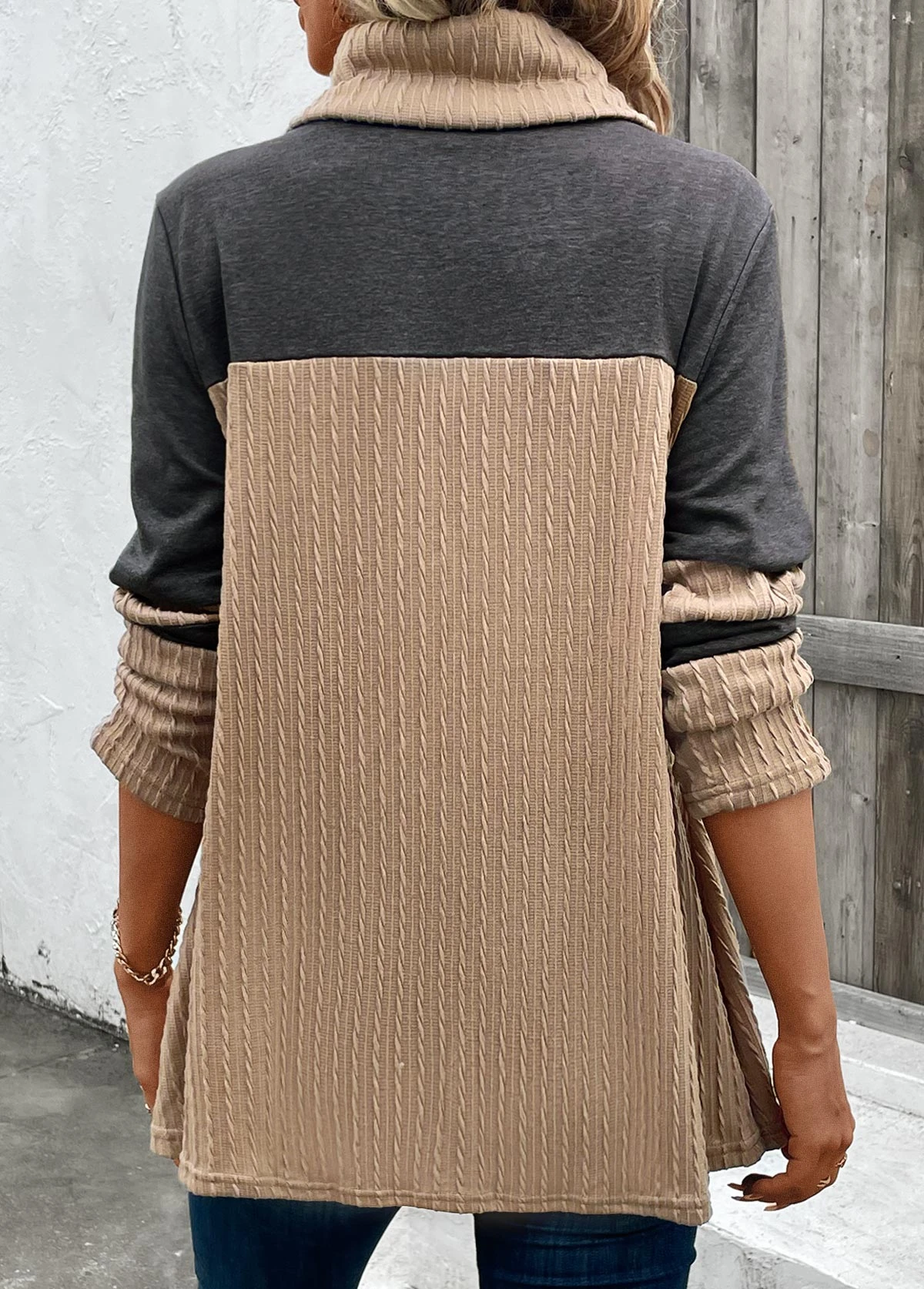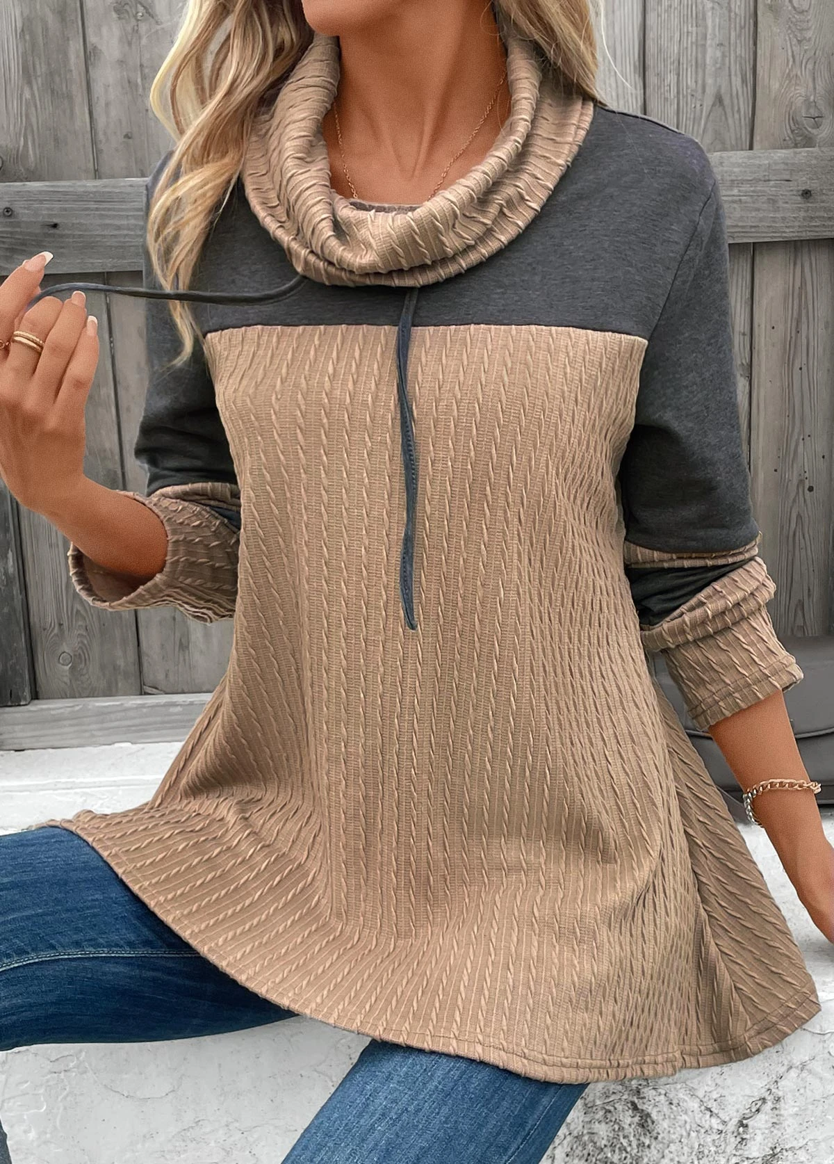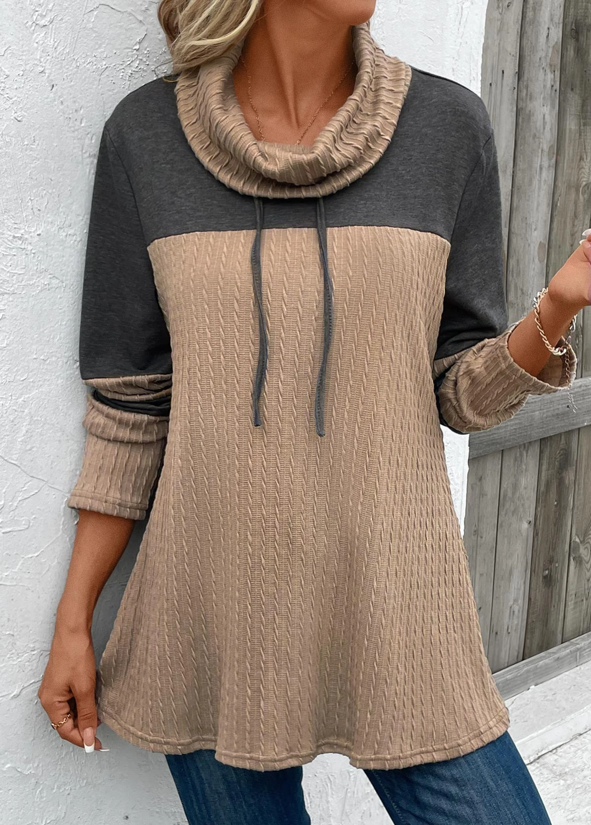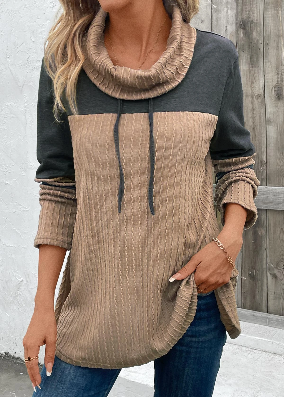 Light Camel Patchwork Long Sleeve Cowl Neck Sweatshirt