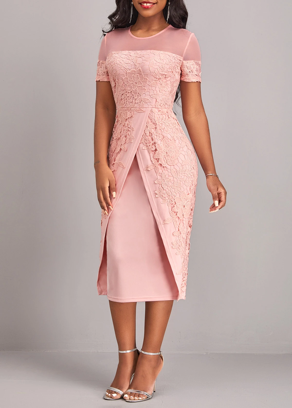 Light Pink Lace Short Sleeve Round Neck Bodycon Dress
