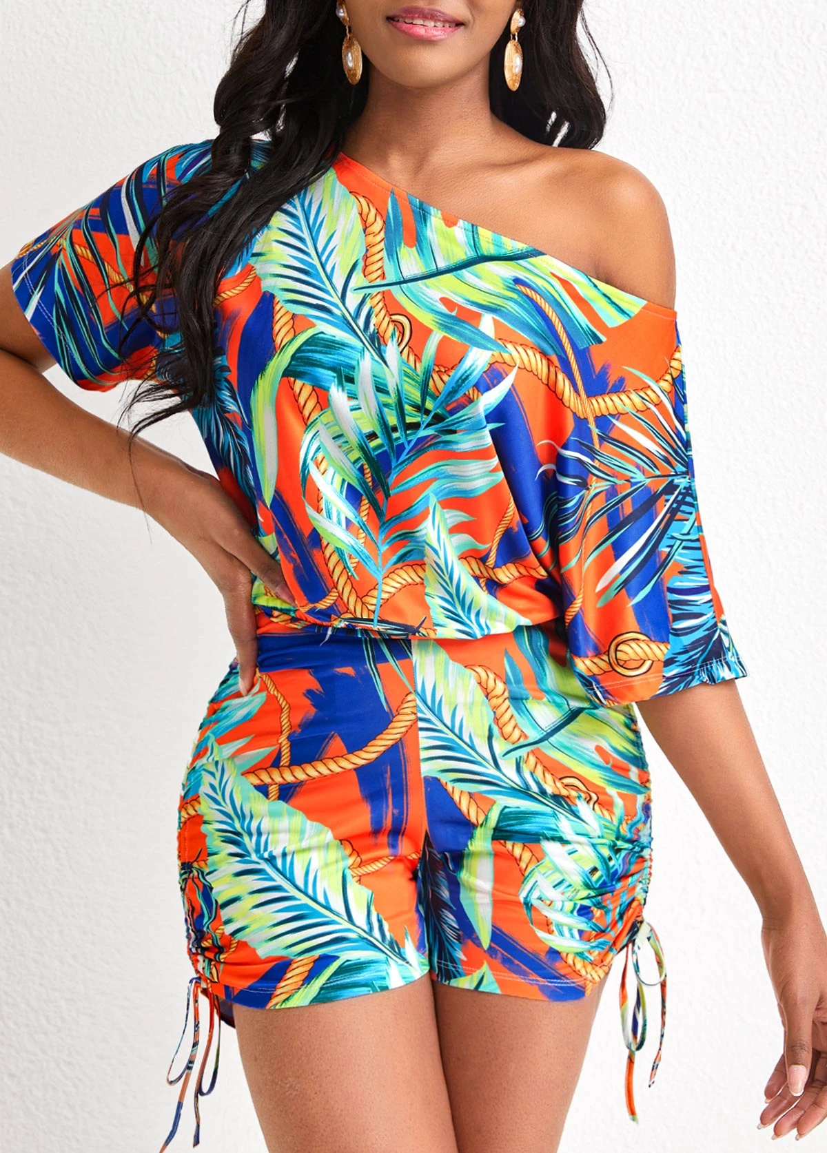 Be the first to review “Multi Color Drawstring Leaf Print Romper” Cancel reply