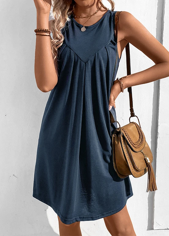 Navy Ruched H Shape Sleeveless Round Neck Dress