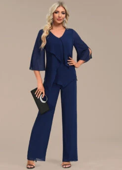 Navy Zipper Long Three Quarter Length Sleeve Jumpsuit