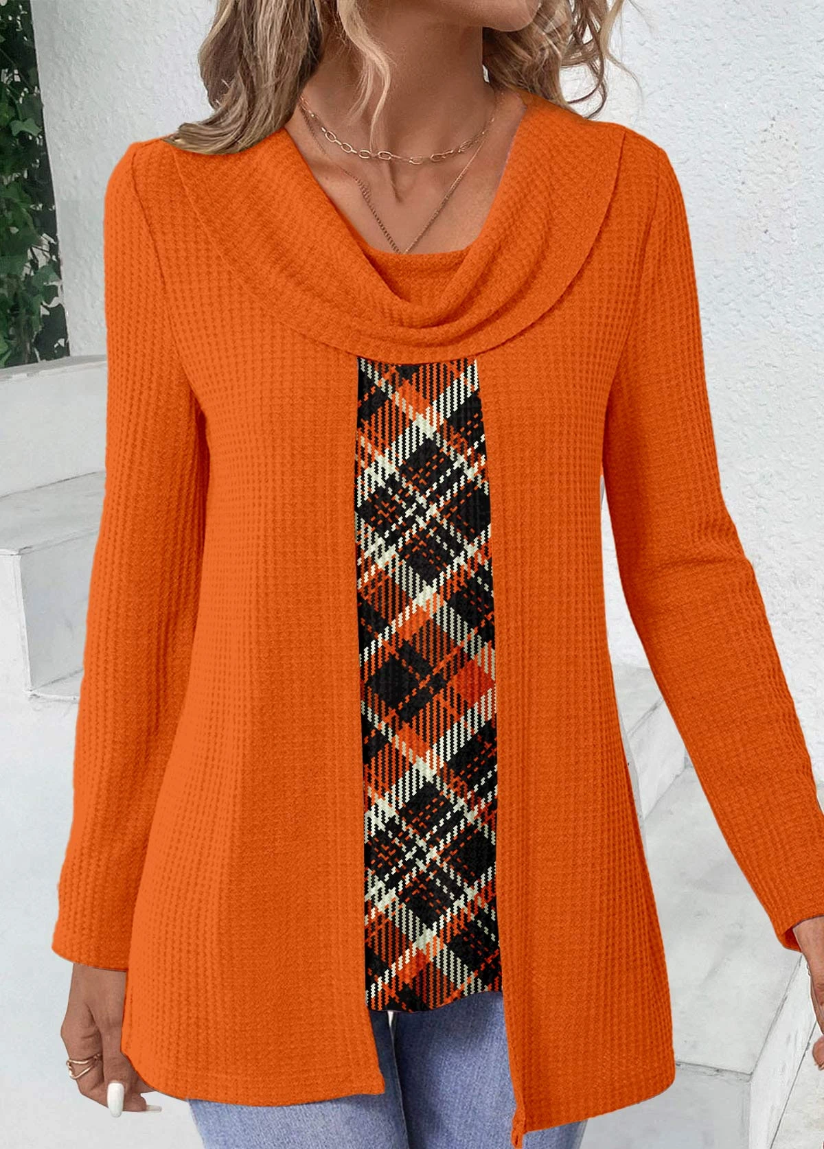 Orange Fake 2in1 Plaid Long Sleeve T Shirt