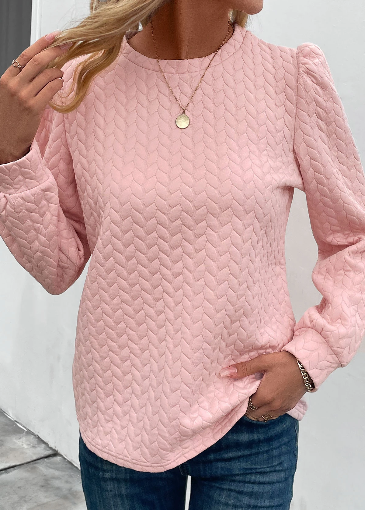 Pink Ruched Long Sleeve Round Neck Sweatshirt