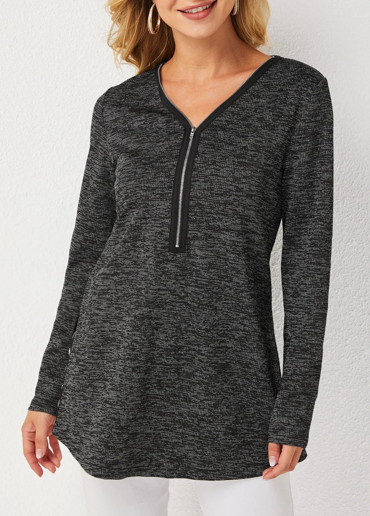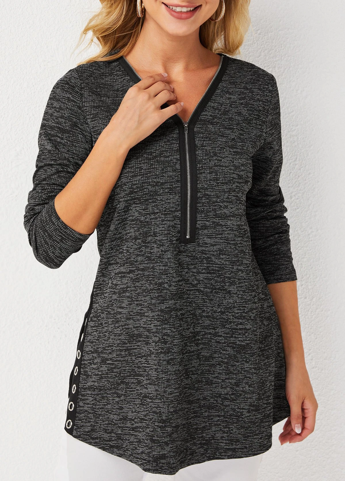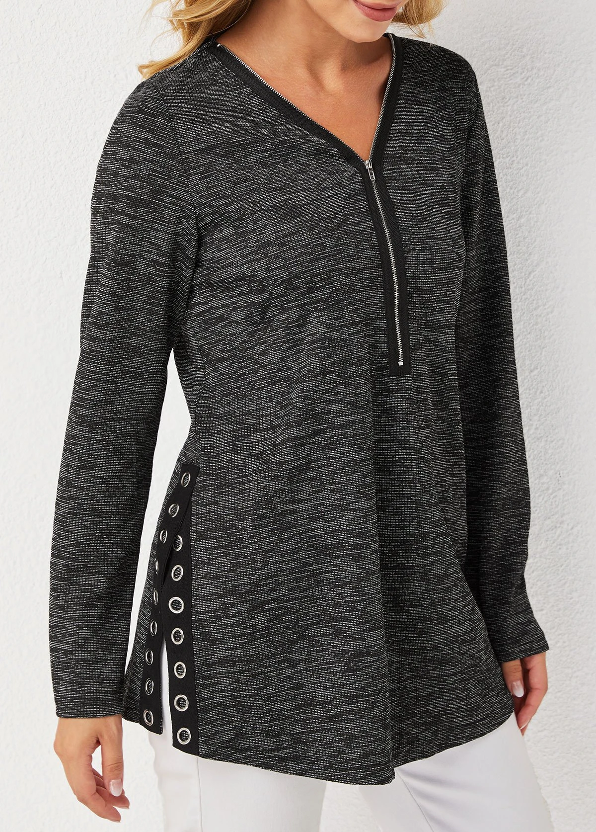 Quarter Zip Long Sleeve V Neck Eyelet Sweatshirt