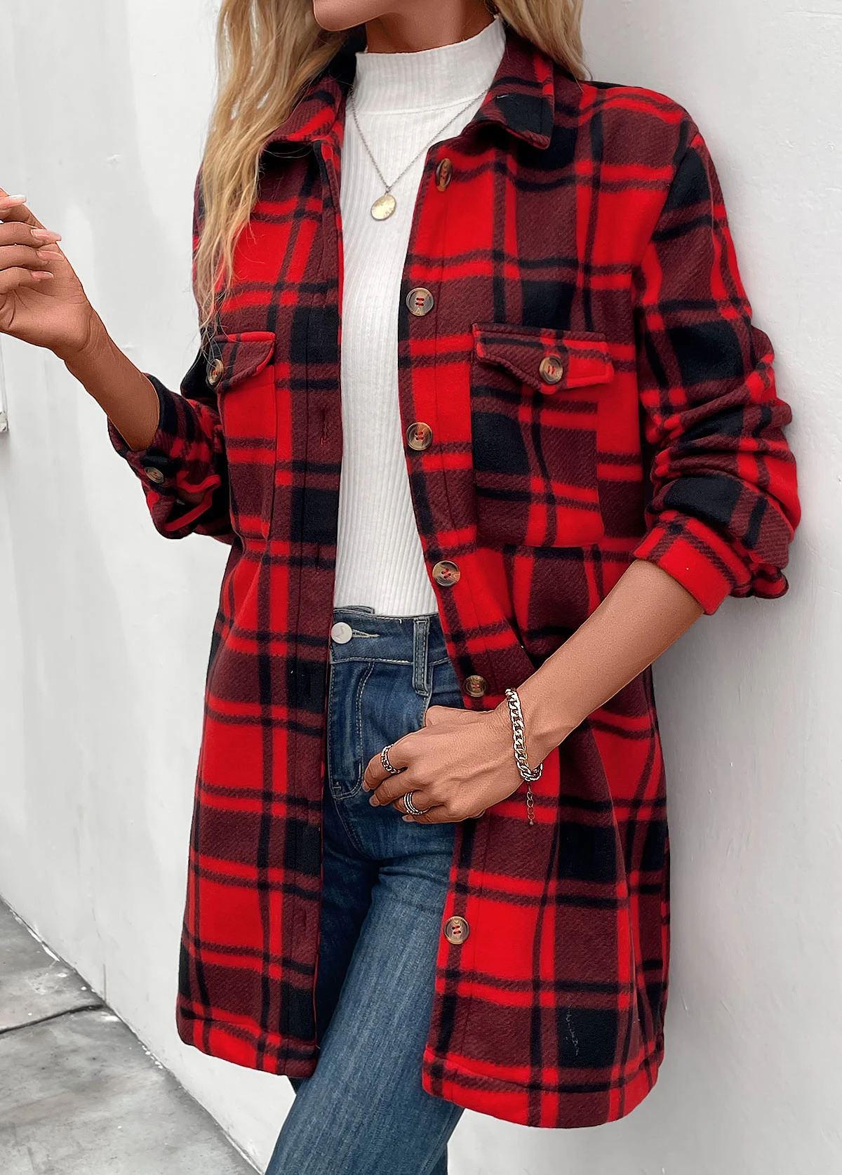 Red Pocket Plaid Long Sleeve Turn Down Collar Coat