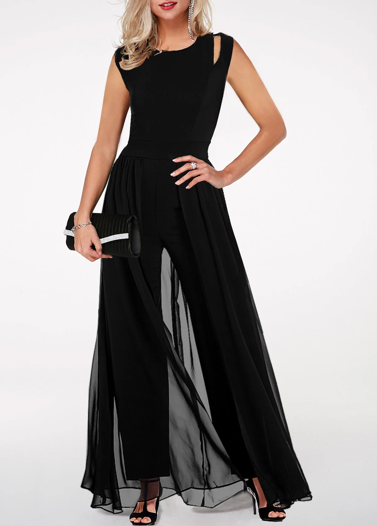 Round Neck High Waist Chiffon Overlay Black Jumpsuit