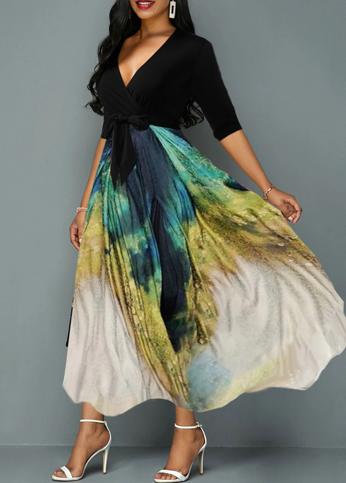 Tie Dye Print Plunging Neck Belted Maxi Dress