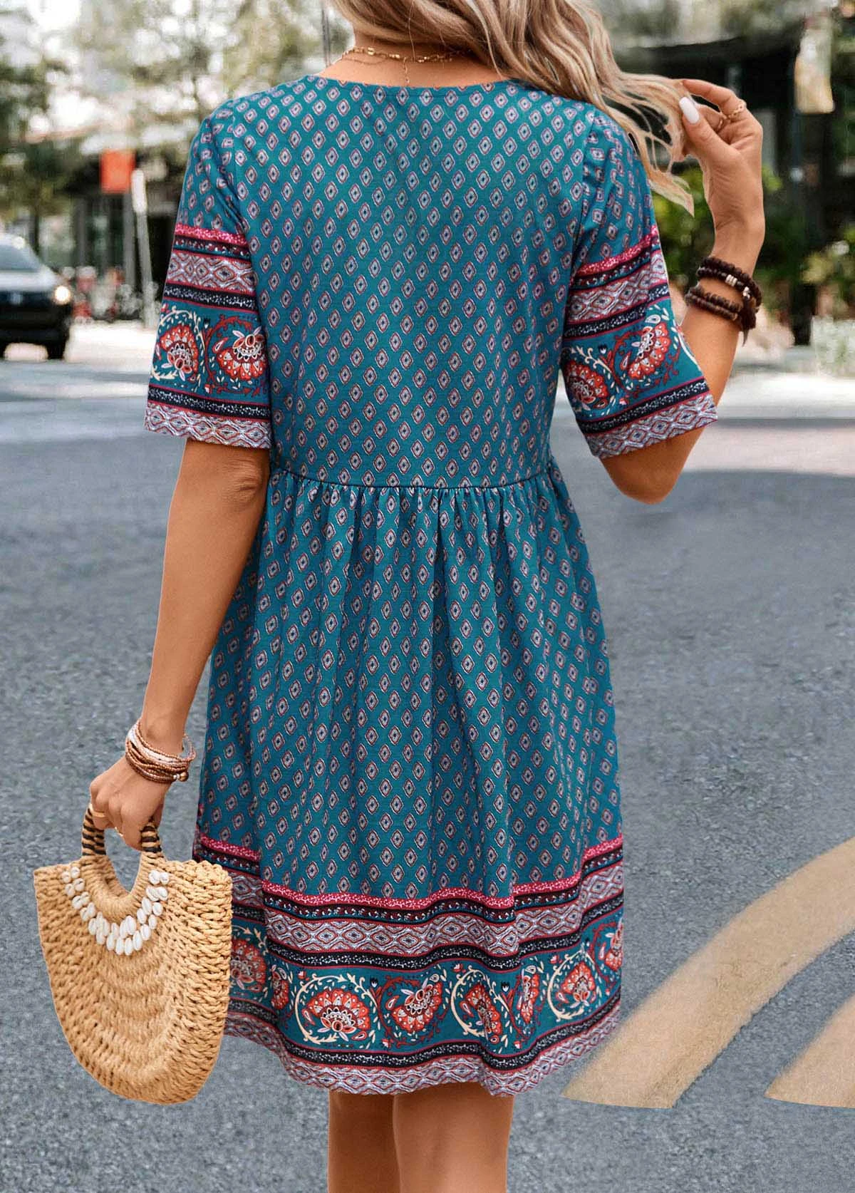 Be the first to review “Turquoise Ruched Paisley Print A Line Dress” Cancel reply