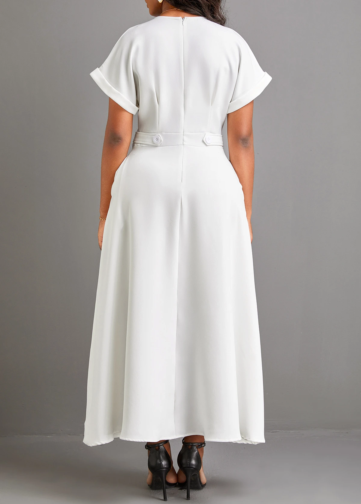 White Pocket Short Sleeve Split Neck Maxi Dress