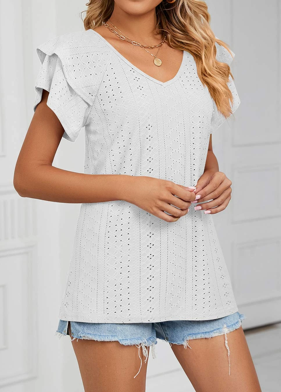White Ruffle Short Sleeve V Neck T Shirt