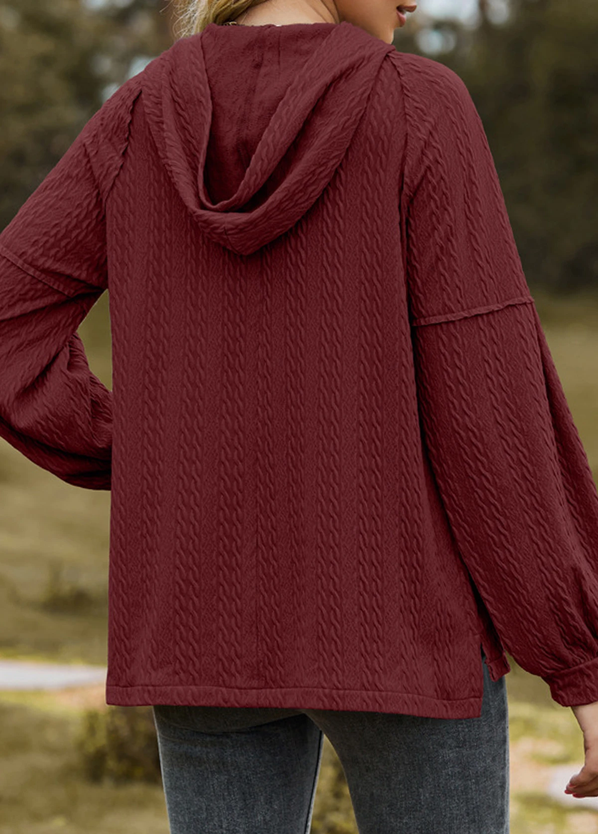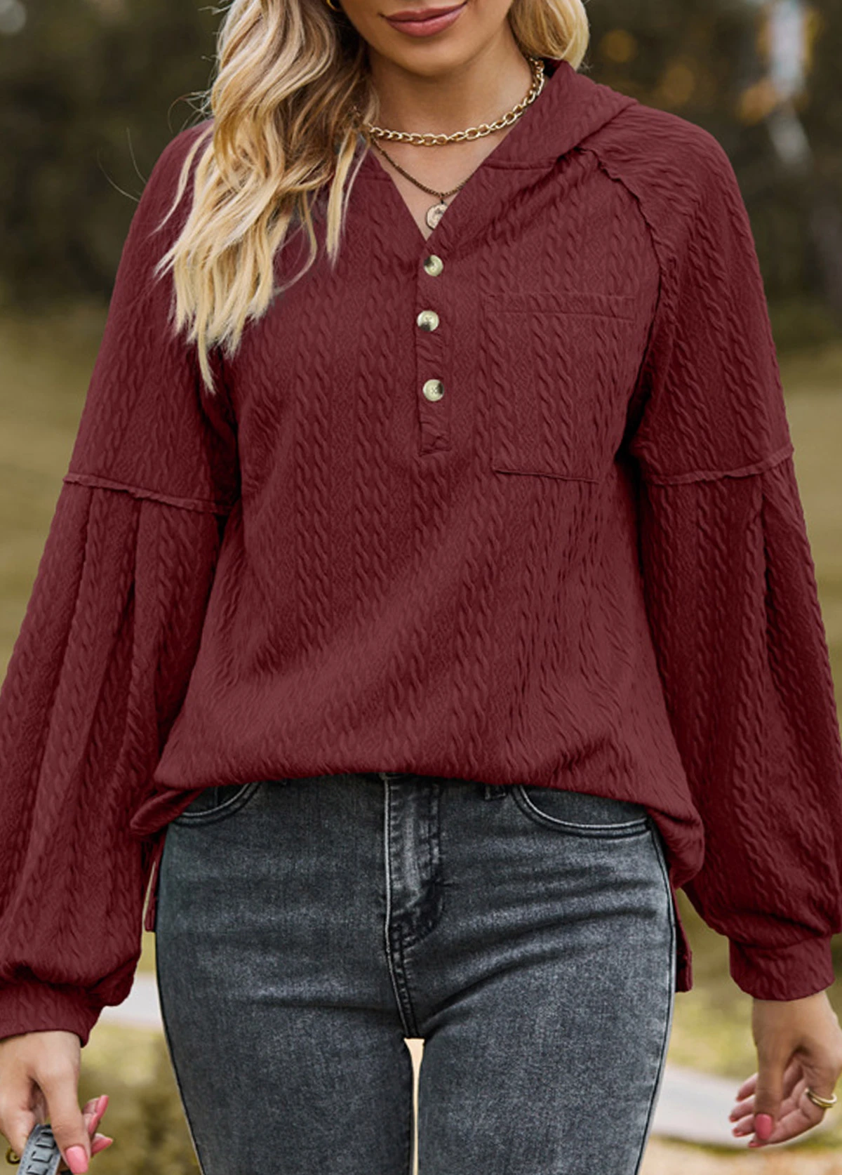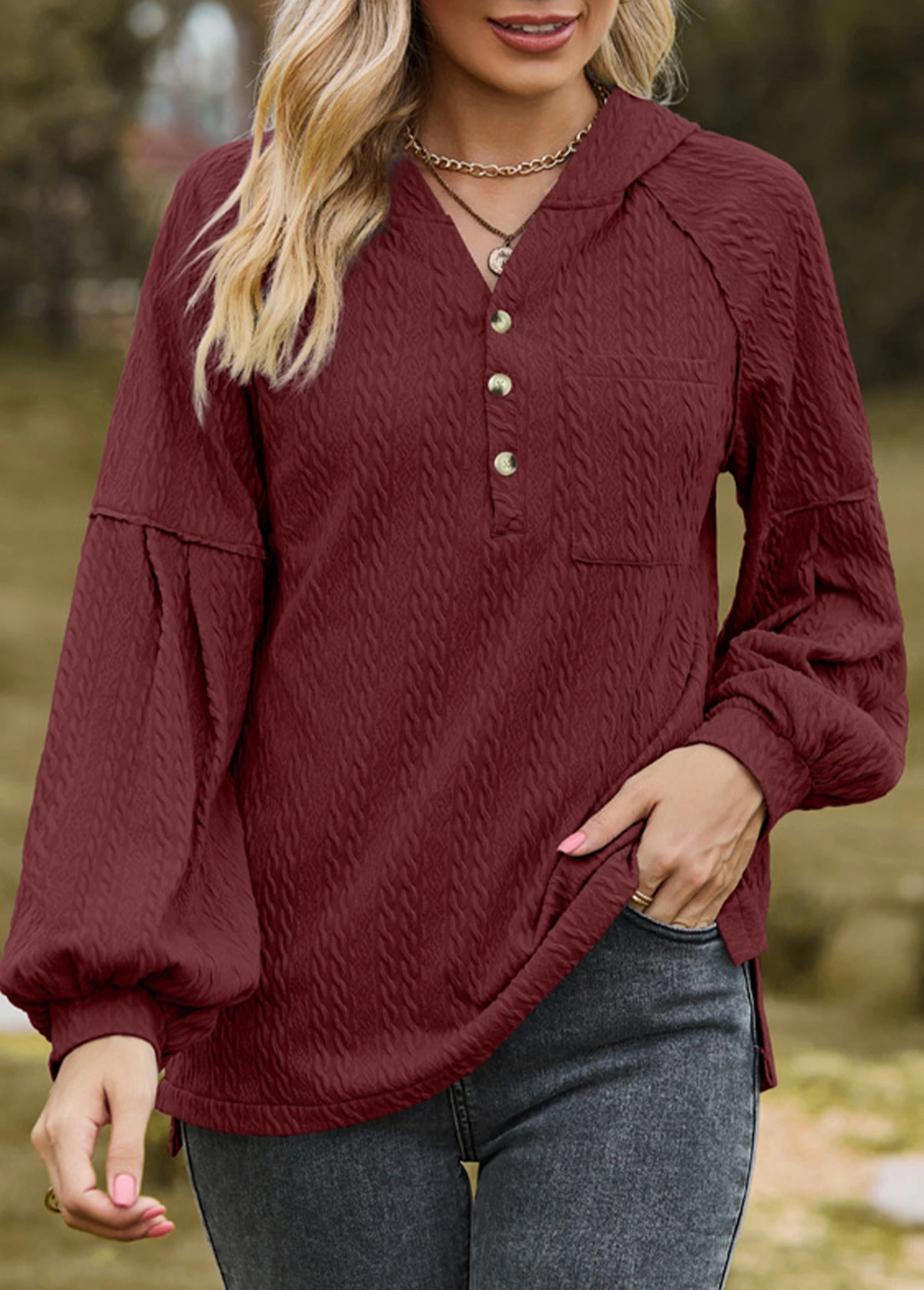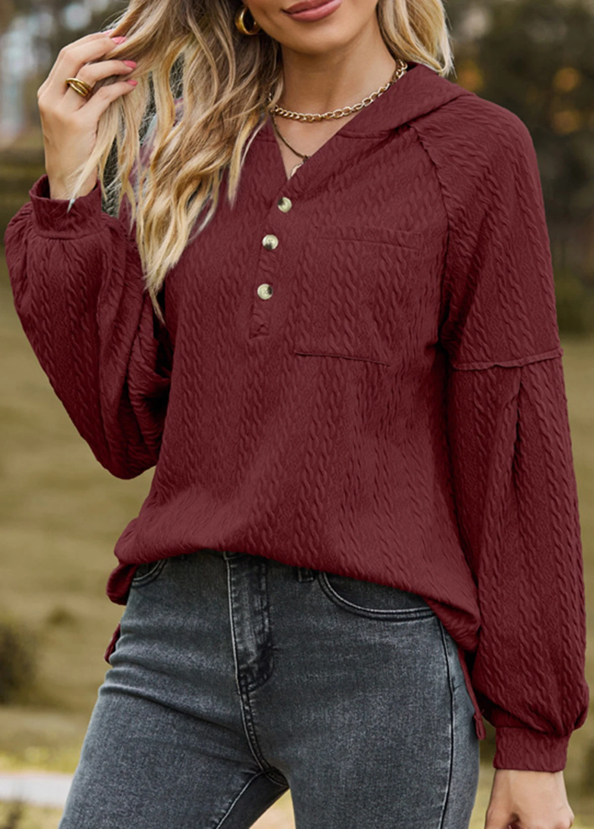 Wine Red Button Long Sleeve Hoodie