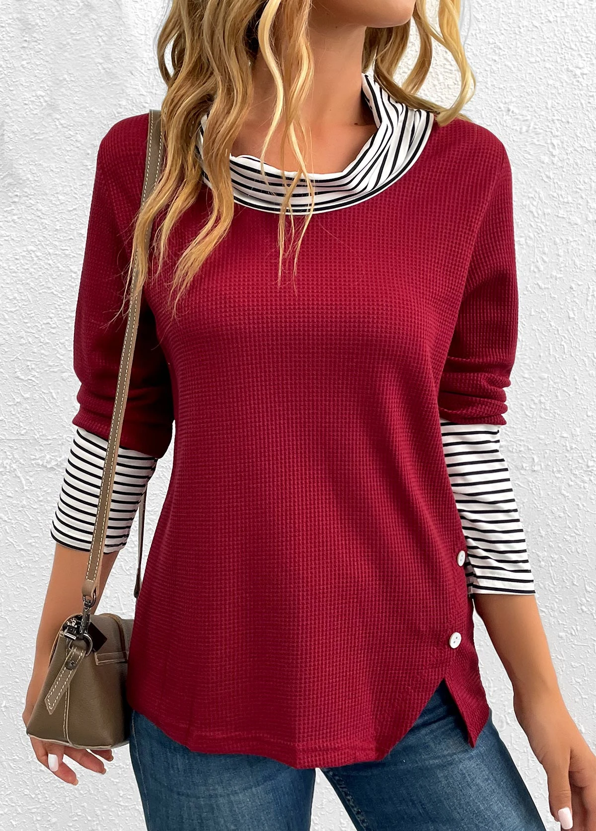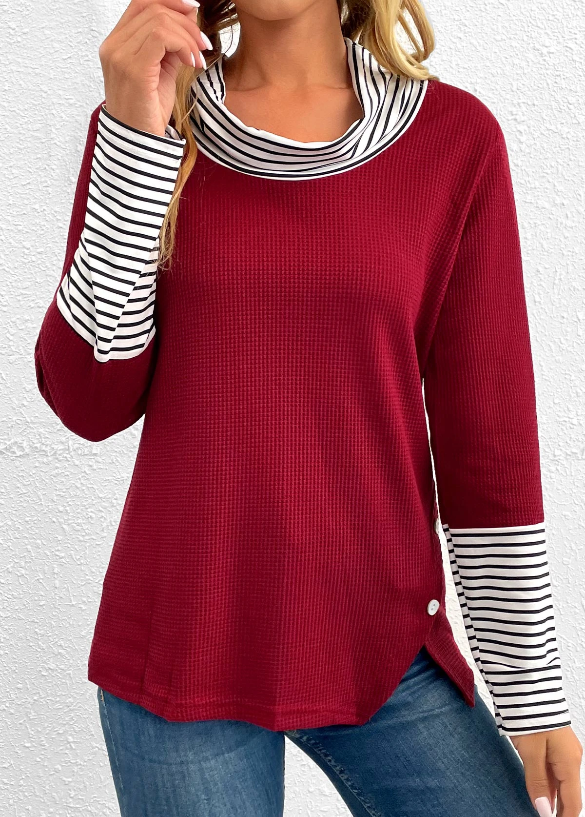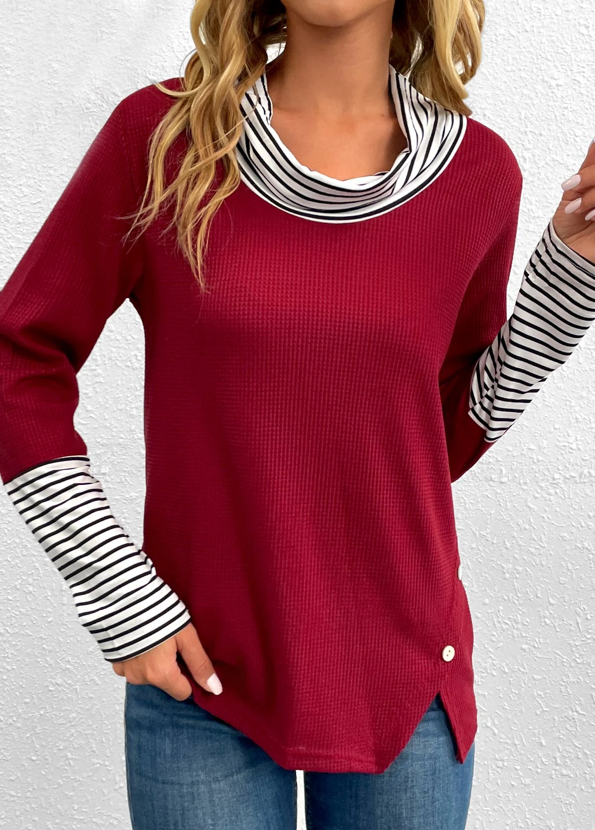 Wine Red Button Striped Long Sleeve T Shirt