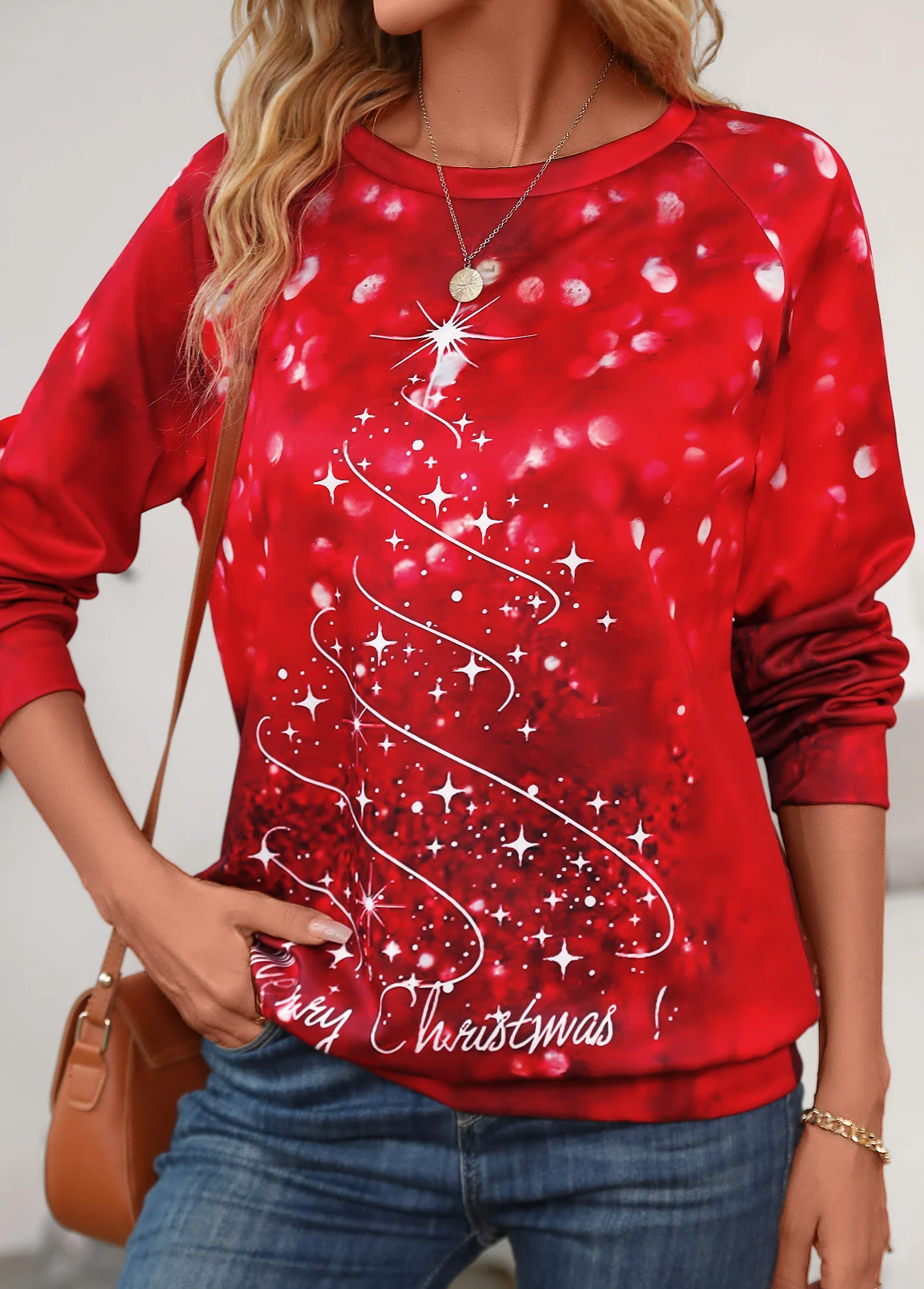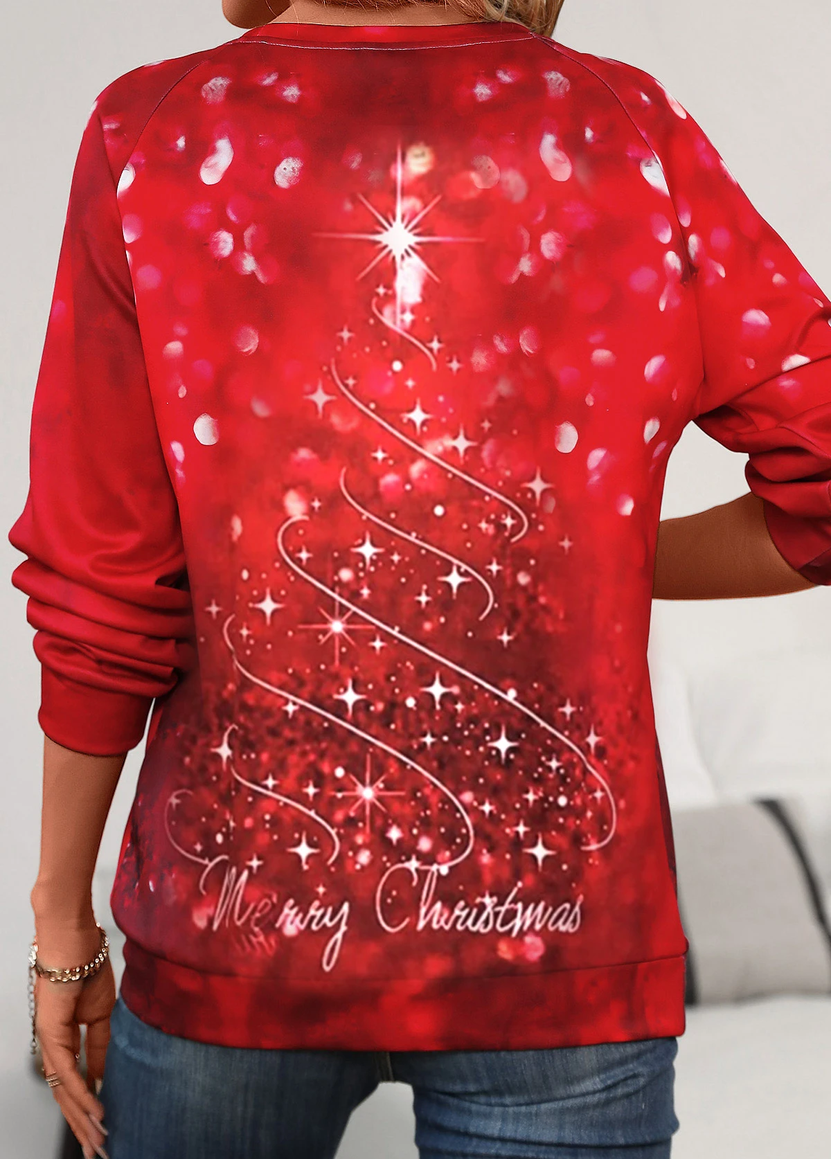 Wine Red Christmas Tree Print Long Sleeve Sweatshirt