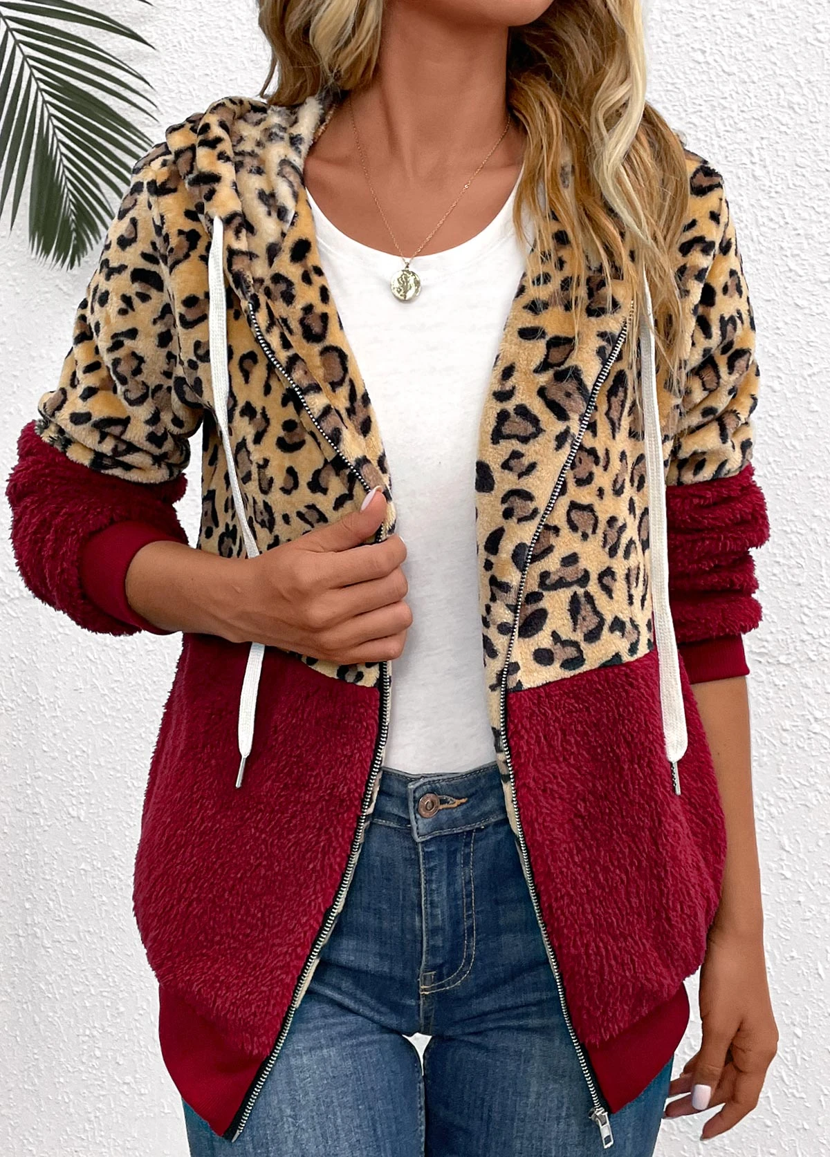 Wine Red Patchwork Leopard Long Sleeve Hooded Coat
